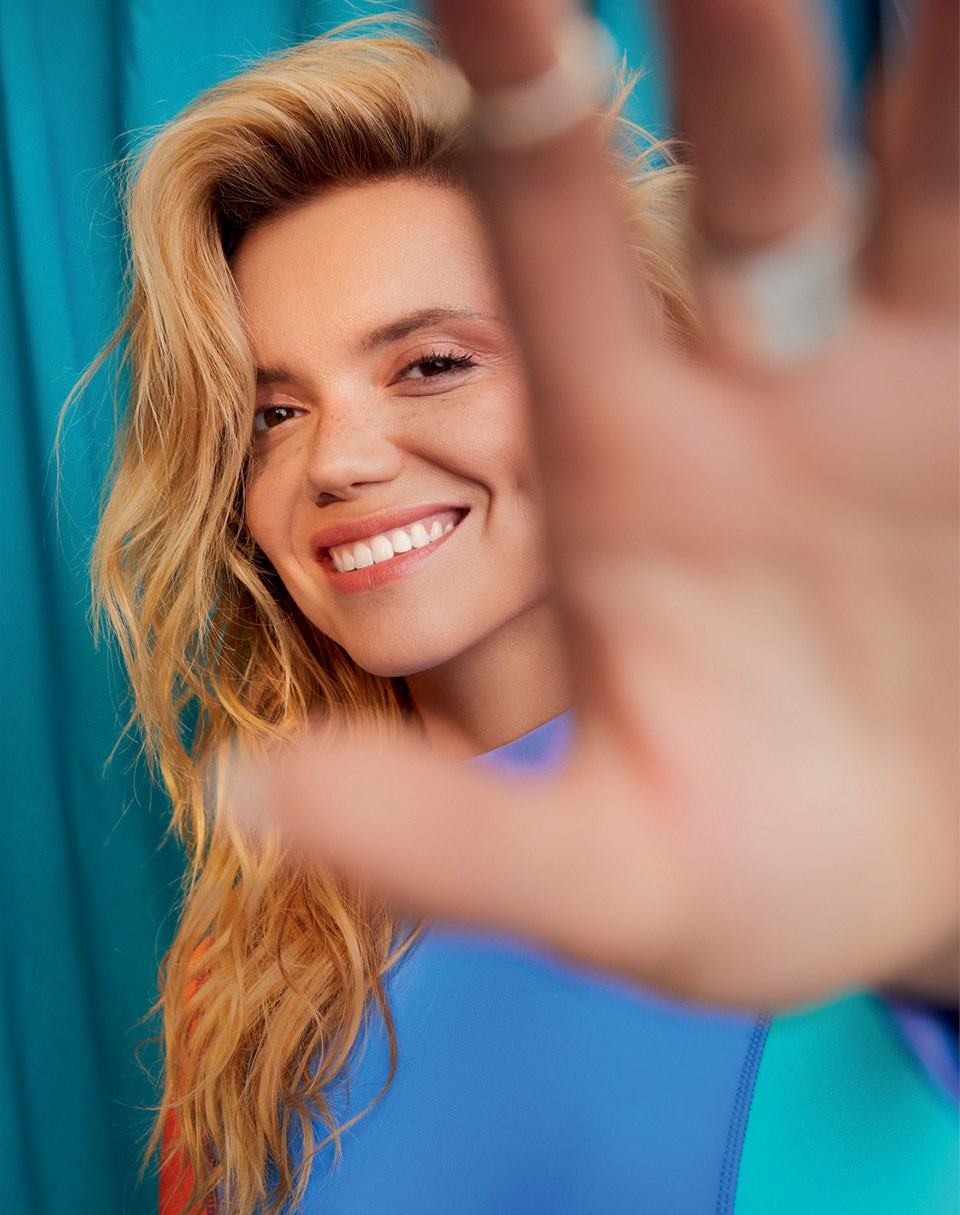 «Серфинг — это в первую очередь блестящая влажная кожа (спасибо жидкому хайлайтеру). Плюс у серферов обгорают выступающие части лица — такой эффект создает легкий дрейпинг на скулах, висках, немного на носу и щеках (я использовала оранжевый тинт). Для целостности образа добавила немного веснушек. А вместо теней взяла глянцевую помаду — еще одна отсылка к влажной коже».