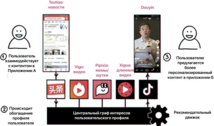 Общая сервисная платформа. Компания использует единую платформу для дублирования технологий (алгоритмов рекомендаций, классификации видео и дополненной реальности) в разных продуктах компании. Например, то, что пользователь читает в новостном приложении Toutiao, влияет на контент, рекомендованный ему в Douyin.
