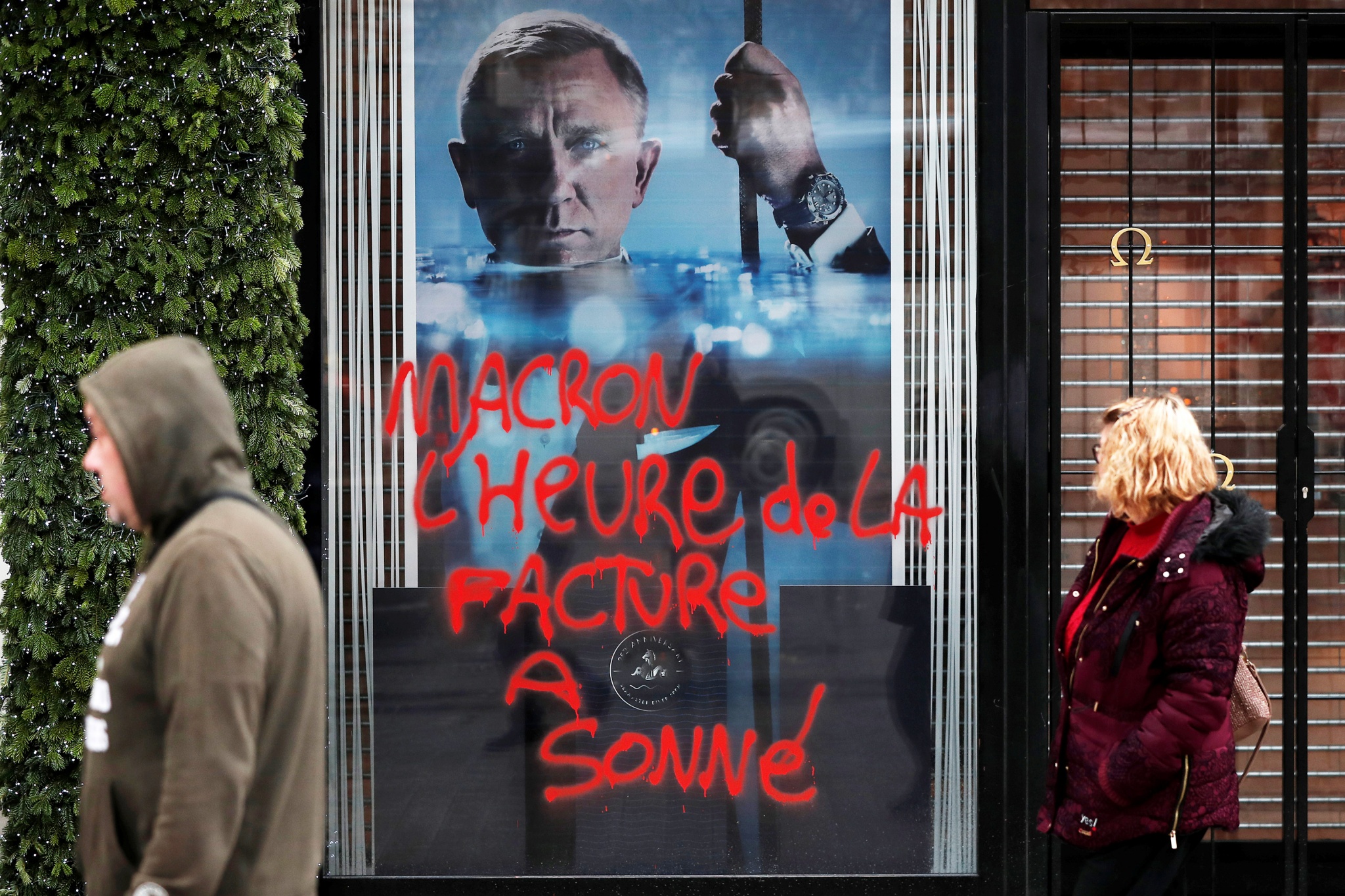 Граффити на киноафише на Елисейских полях: "Макрон, пришло время платить по счетам".