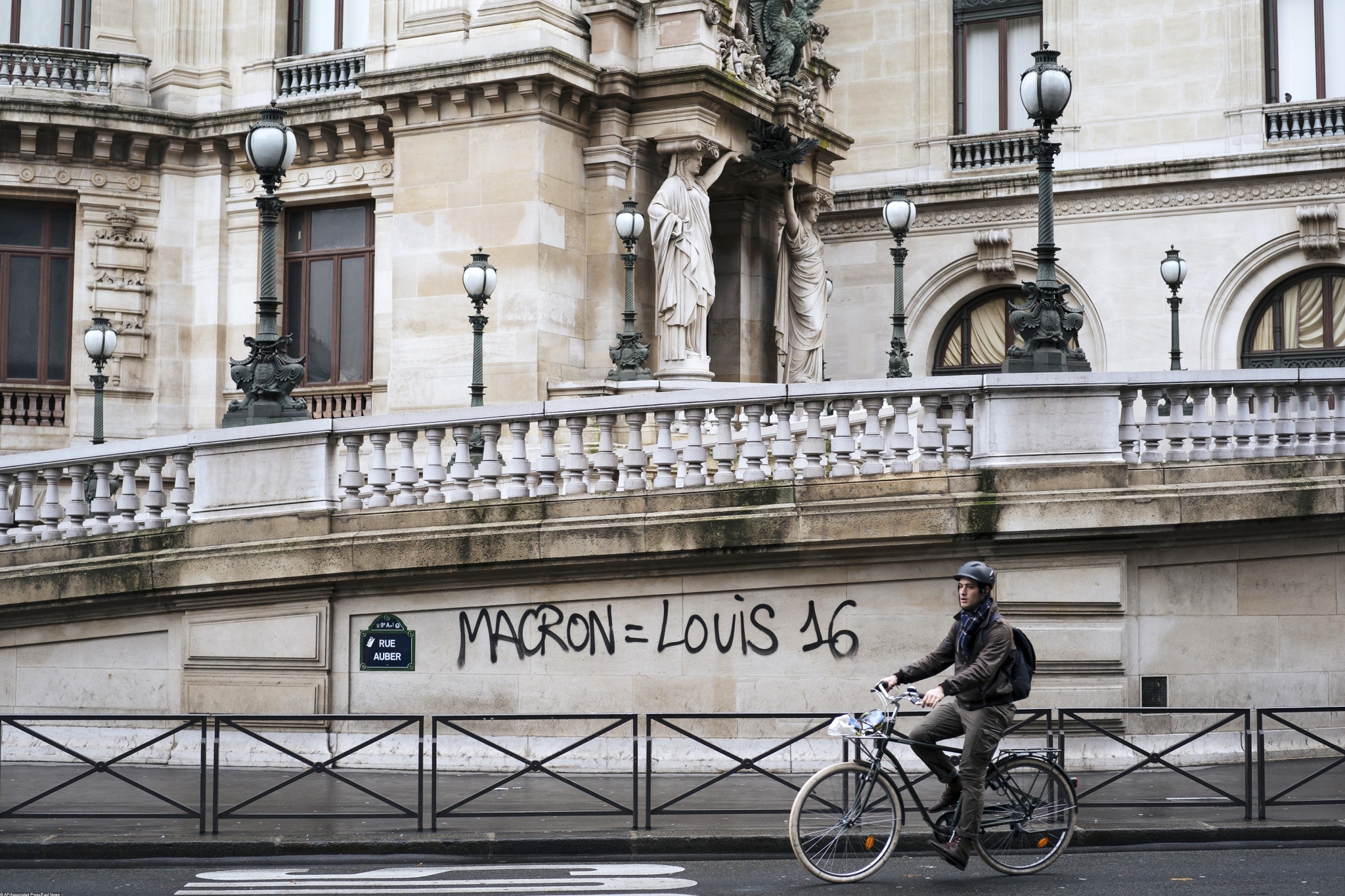 "Макрон = Людовик XVI", — надпись на здании Оперы Гарнье в Париже отсылает к последнему французскому королю Старого порядка, свергнутому в ходе Великой французской революции и казненному в 1793 году.