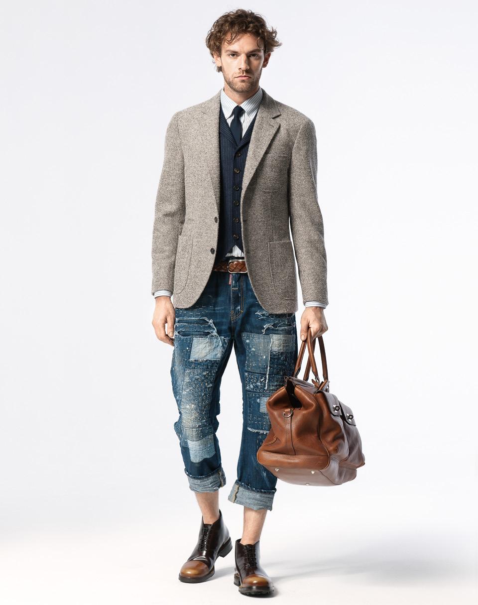 Для завершения винтажного образа (твидовые пиджаки, саквояжи, жилеты) достаньте из шкафа самые старые и видавшие виды джинсы. Чем больше на них повреждений, тем лучше. Если «ран» мало — смотрите страницу справа.