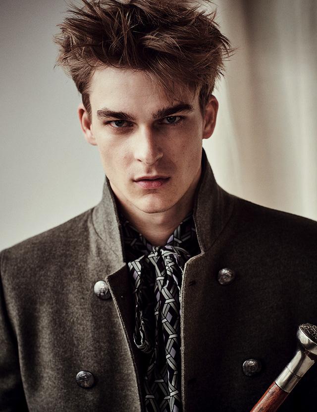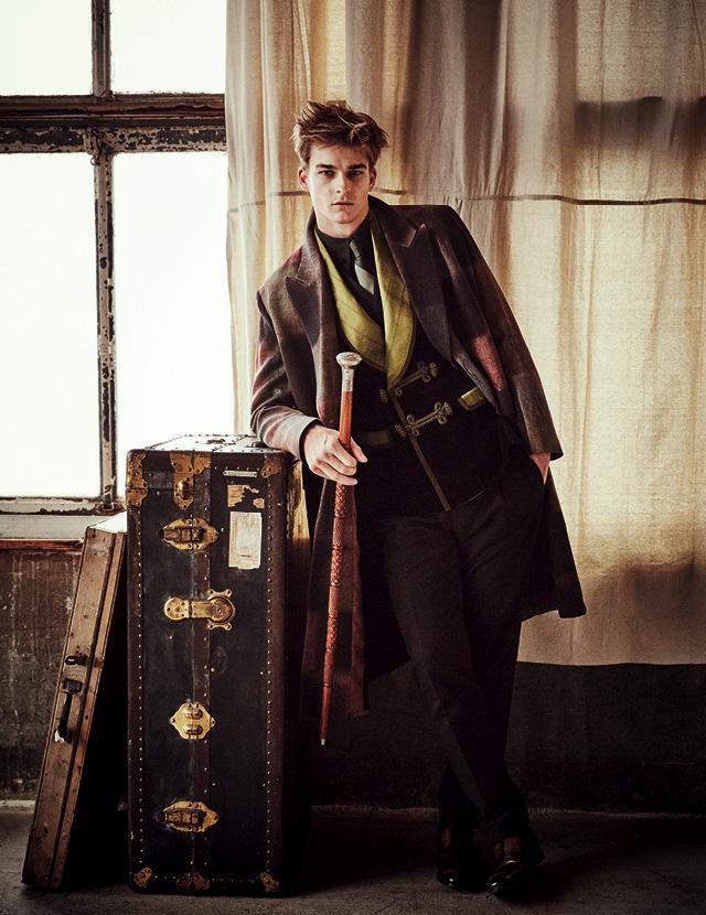 Шерстяное пальто, Paul Smith; домашняя куртка из бархата с атласными деталями, шерстяные брюки, жилет из шерсти, хлопковая рубашка, ботинки из кожи, все Dolce & Gabbana; шелковый галстук, Title of Work.
