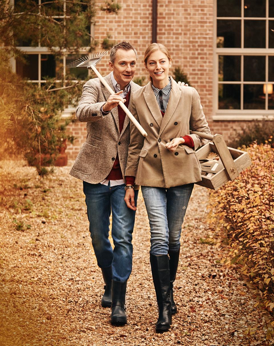 На Елизавете: бархатный пиджак, кардиган из кашемира, хлопковая рубашка, джинсы, все Brunello Cucinelli; сапоги из кожи, Loriblu.
