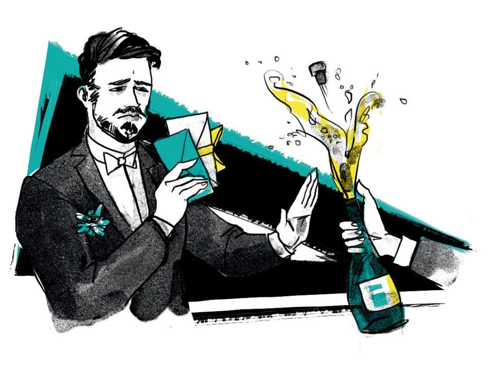 Безусловно, нужно иметь мужество, чтобы смотреть на происходящее трезвым. Но правило «лучше сразу напиться» работает только для гостей. Сразу смиритесь с тем, что все пойдет не так, как вы планировали: вам еще понадобятся силы не только на то, чтобы дотащить на руках жену до брачного ложа и составить ей бодрствующую компанию, но и тщательно пересчитать подаренные на свадьбу деньги. Делать это во время вручения подарков не очень красиво, даже если вам кажется, что некоторые из врученных конвертов пустые.