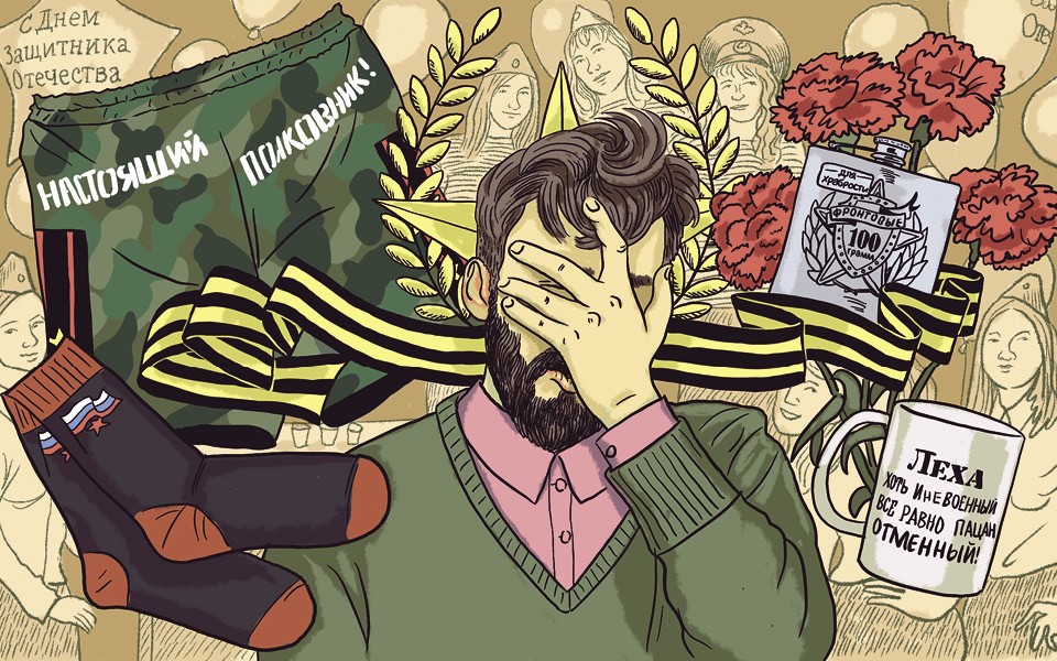К гендерным праздникам принято относиться снисходительно. Носки и бритвенные станки от бухгалтерии нашим дорогим защитникам, «фронтовые сто грамм», «я сам не служил, но…», корпоратив, лишний выходной, на улице каждый второй косплеит боевого офицера, по телевизору концерт военно-патриотической песни. Через две недели полярность меняется, но тон остается прежним: мимоза и чахлые гвоздики для наших милых дам, «девочки, а давайте лучше водочки», миллионы криво пожаренных мужскими руками яичниц и плохо подметенных ими же полов, корпоратив, лишний выходной, по телевизору бесконечный осенний марафон тягучих фильмов про позднюю любовь немолодых и не очень красивых людей. От всего этого, в общем, несложно и даже приятно дистанцироваться — так в свое время походы на пироги к бабушке, поначалу казавшиеся главным развлечением недели и едва ли не смыслом жизни, постепенно теряли остроту ощущений и превращались сначала в обыденность, а потом и в обременительную обязанность, с которой хочется поскорее покончить и заняться более интересными делами.
