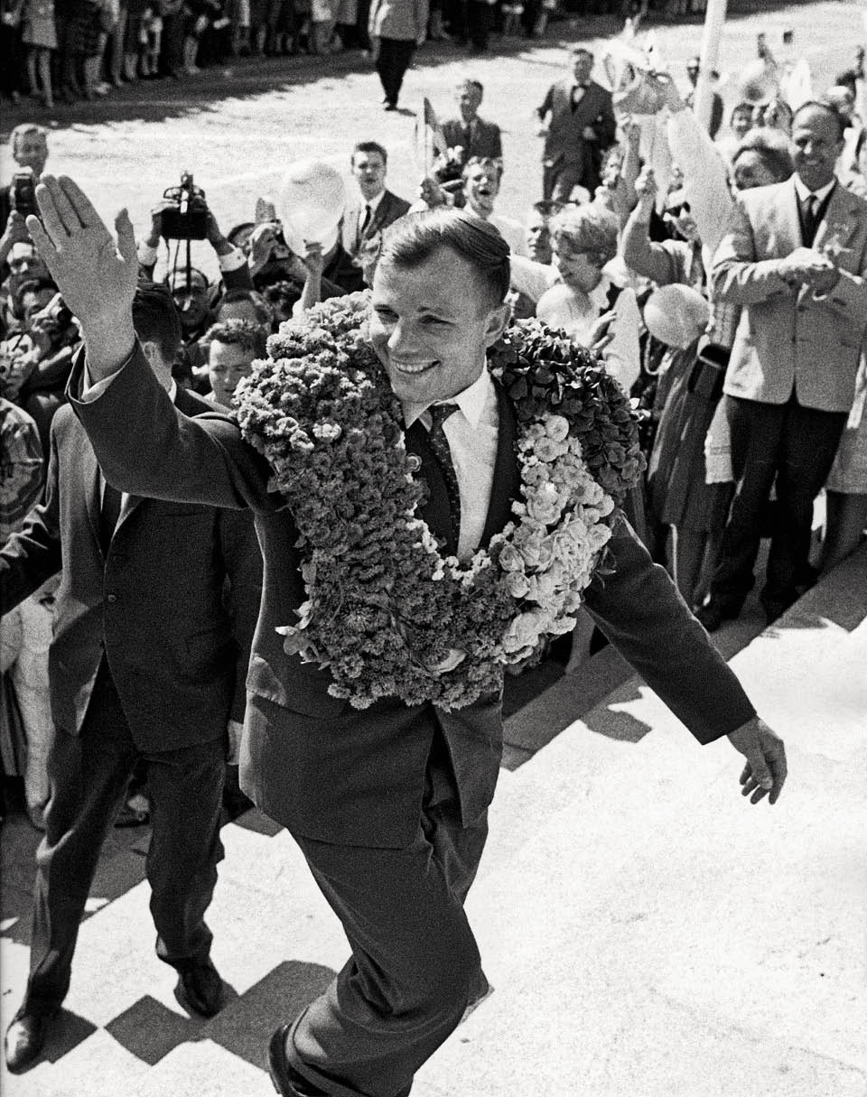 Совсем в другом образе Юрий Гагарин предстал во время визита в Германию. Светлая рубашка с узким воротником, манжеты на запонках, галстук с небольшим узлом — все строго по моде 1960‑х годов. И фирменная обезоруживающая улыбка. Такими же улыбками отвечает первому человеку, вернувшемуся из космоса, ликующая толпа.