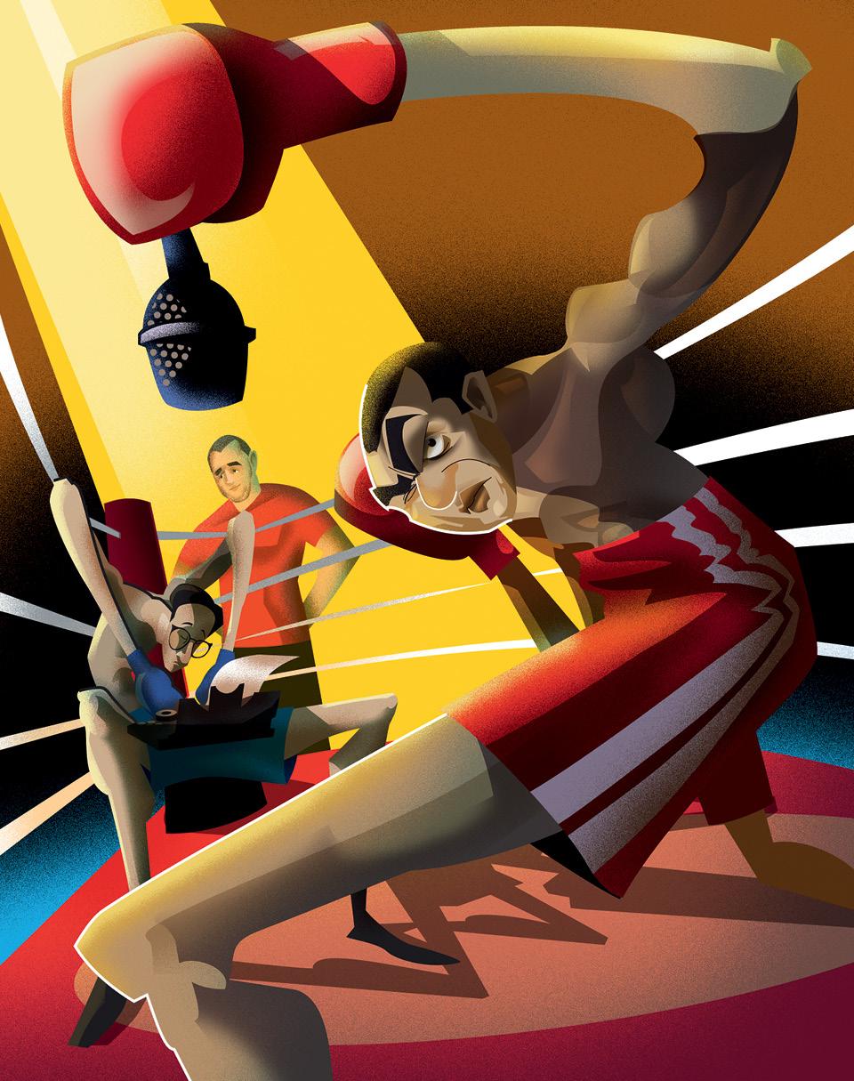 Я не то чтобы физически неподготовленный подопечный: спортзал три раза в неделю, уроки фехтования в анамнезе — пристегните ко мне провод, дайте маску и держись, оппонент. Все это мне предстоит забыть. Как Баграт уже упоминал, для боксера главное голова, но не как аппарат по приему пищи, а как мыслительный центр. Пока я бегаю по залу и выполняю под его руководством простейшие комбинации, он не перестает со мной разговаривать. Объясняет, периодически отправляя меня отжиматься, что боксерам важнее трицепс, а борцам — бицепс. Потому что первые привыкли отдавать, а вторые — только брать. Кажется, это очень отвлекает и заставляет путаться ноги и руки, но к середине занятия методика Махкамова становится понятна: разговаривая с тобой, он как раз помогает мозгу забыть о неловких конечностях и двигаться на автомате. Вот что значило «включить голову».