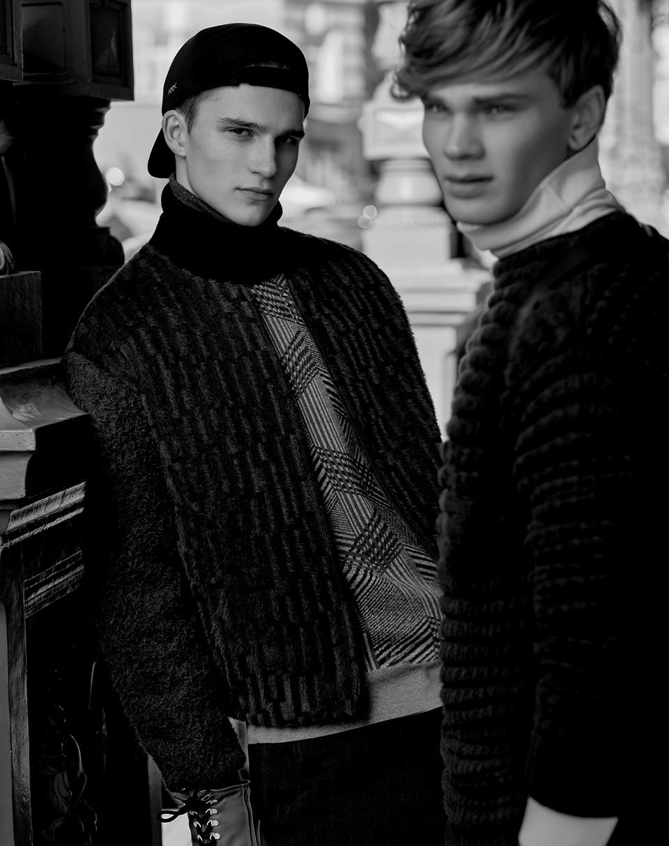 Кашемировый джемпер, водолазка из кашемира и шелка, спортивные брюки из шерсти с деталями из кожи, все Ermenegildo Zegna Couture.
