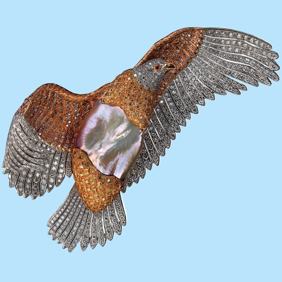 Золотая брошь Eagle с бриллиантами, рубином и жемчугом, Buccellati, цена по запросу.