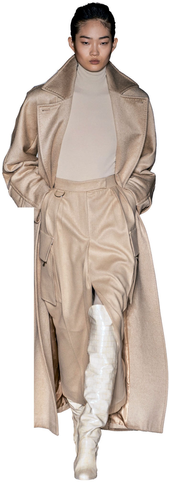 Оттенки бежевого и серого у Max Mara дополнили яркие синие, бирюзовые и желтые тотал-луки – кстати, в этих цветах появились и всеми любимые teddy coats. В целом в коллекции прослеживается влияние и 80-х, и 90-х: широкие плечи, костюмы-двойки и высокие сапоги.