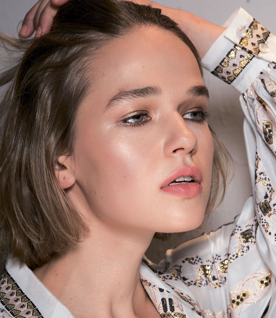 «Главный тренд лета, безусловно, сияние! Для максимального эффекта смешайте на скулах румяна и хайлайтер (в новом средстве Sunset Blooming Highlighter & Blush они в одной упаковке, что очень удобно). На веки нанесите золотые тени, а на губы – яркую помаду с холодным подтоном. Это трио подчеркнет загорелую кожу».