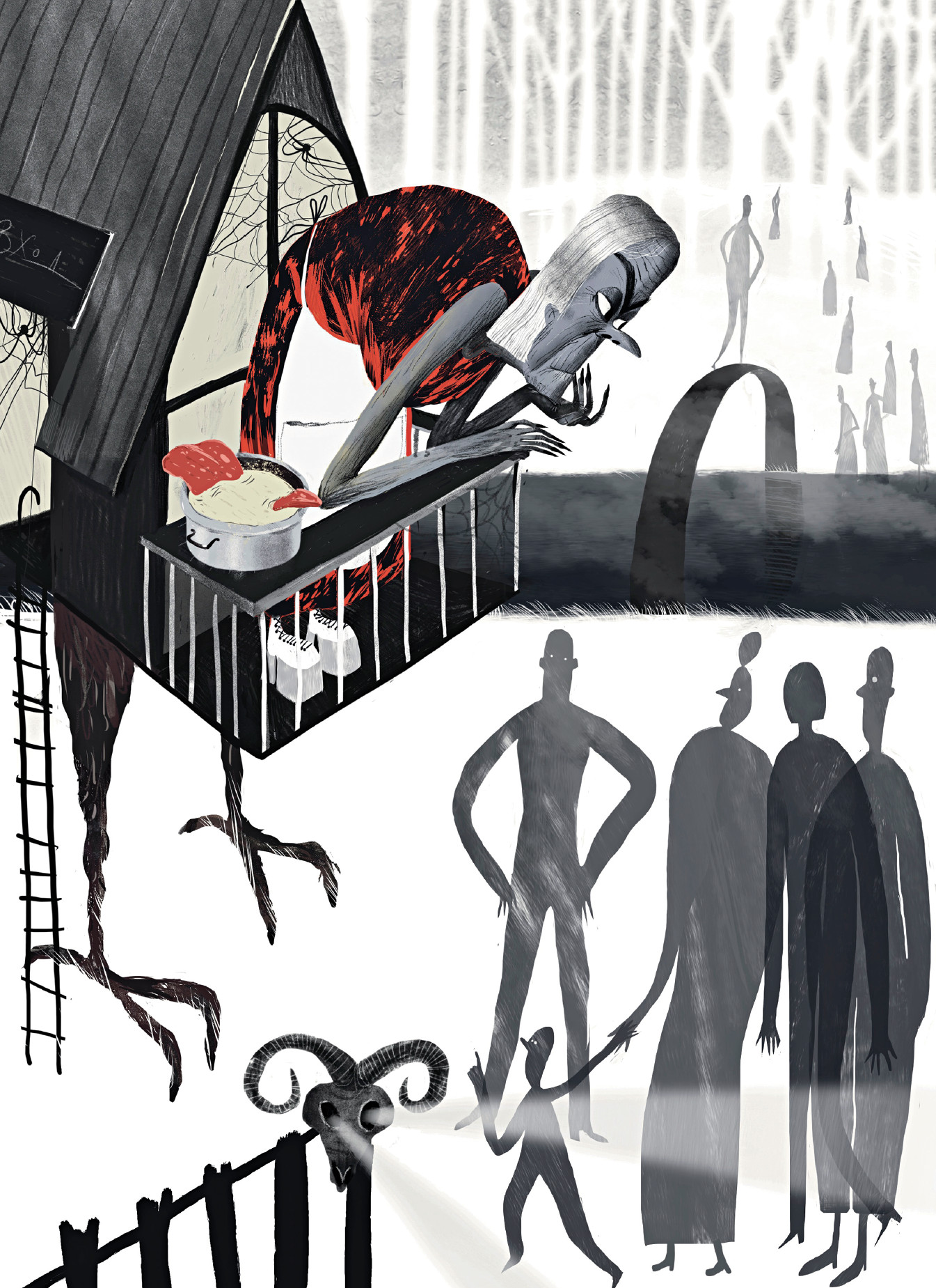 В лесу Родной речи страшно, ползти холодно и колко. Она думает пойти назад к избушке, но не знает куда. Деревья за ней и над ней сомкнулись, как волна. Родная речь в настоящем лесу впервые за много лет. Он живой, темный и громкий. Тут пищат, плачут, рычат, дышат. К языку приближается кто-то, не такой крупный, как человек, Ега или избушка, или как волк, но Родной речи чуть крупнее. Та замирает, ее изучает влажный и мягкий нос, потом лижет мелкий шершавый язык, а сверху и по бокам колется. Родной речи становится щекотно, она передергивается, еж отбегает. Родная речь ползет и ползет дальше. Ее колют еловые иголки, перелезает через бревно, прыгает с него, неудачно брюхом, и еловая игла втыкается ей прямо в самое нежное место на кончике. Родная речь плачет, потом пытается вытащить иголку, чешась о низ бревна, но игла заседает еще сильнее. Родная речь плачет, плачет и плачет. Ползет дальше. Слышит удары по дереву и дыхание. Человеческое, живое. Темнота расступается, но как-то не так, как обычно, а желтым электрическим светом. Дровосек рубит березу, а во лбу у него горит электрический свет. Родная речь слышит приближение кого-то магического, но не Еги. Забирается в сапог Дровосеку. К нему подходит большая волчица, принюхивается-принюхивается и рычит. Тот не выпускает пилу и убегает как может. Родную речь трясет в голенище вверх и вниз, вверх и вниз.