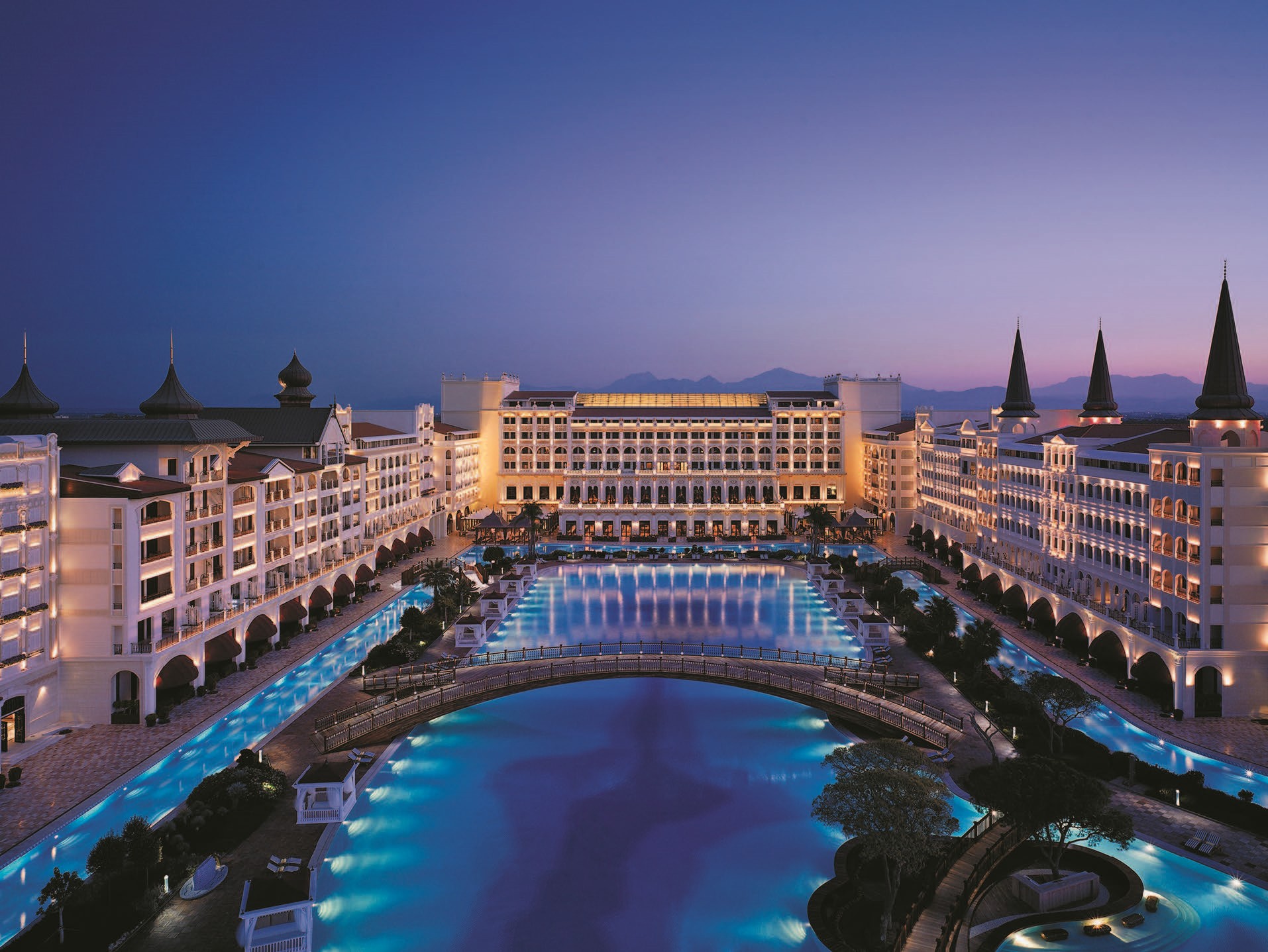 Отель, расположенный на берегу Средиземного моря, в Анталии, похож на огромный город и своей архитектурой напоминает одновременно и Стамбул, и что-то совершенно сказочное. Здесь есть здания в дворцовом стиле, пышные сады, покрытые сусальным золотом арки и даже собственный «пролив» – лагуна оформлена в виде бассейнов, соединенных друг с другом. Кроме того, на территории Titanic Mardan Palace можно увидеть реплики самых известных строений Османской империи – от Девичьей башни до дворца Долмабахче.
