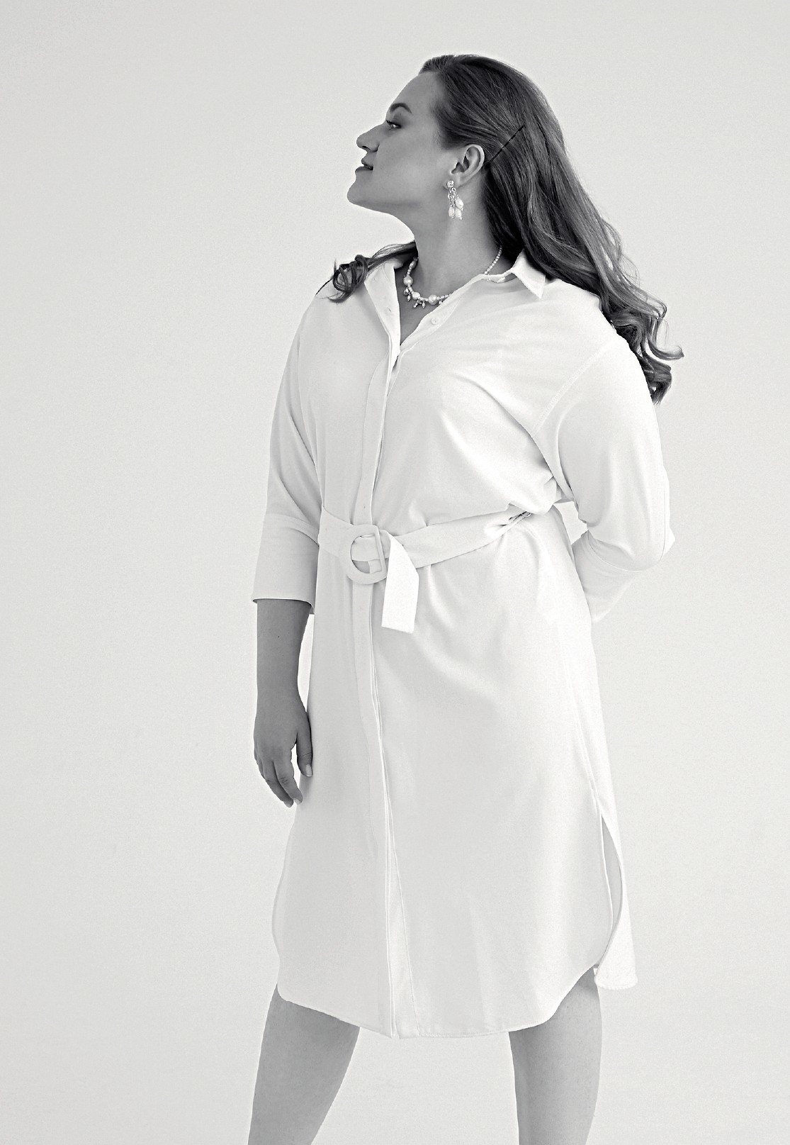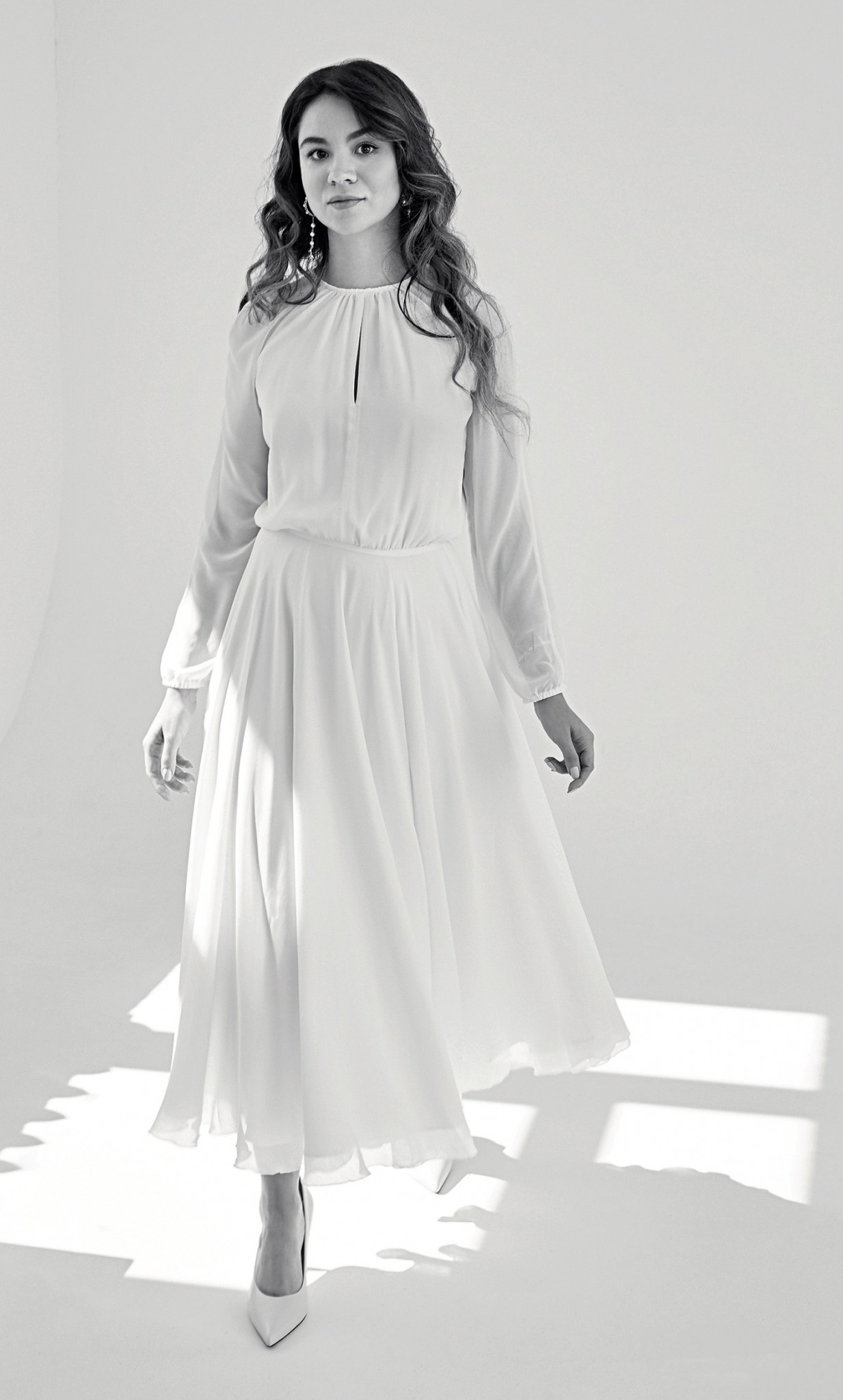 На Алине: платье из вискозы, Laroom; кожаные туфли, «Эконика»; серьги из ювелирного сплава с жемчугом, Sexy Fish Jewelry.