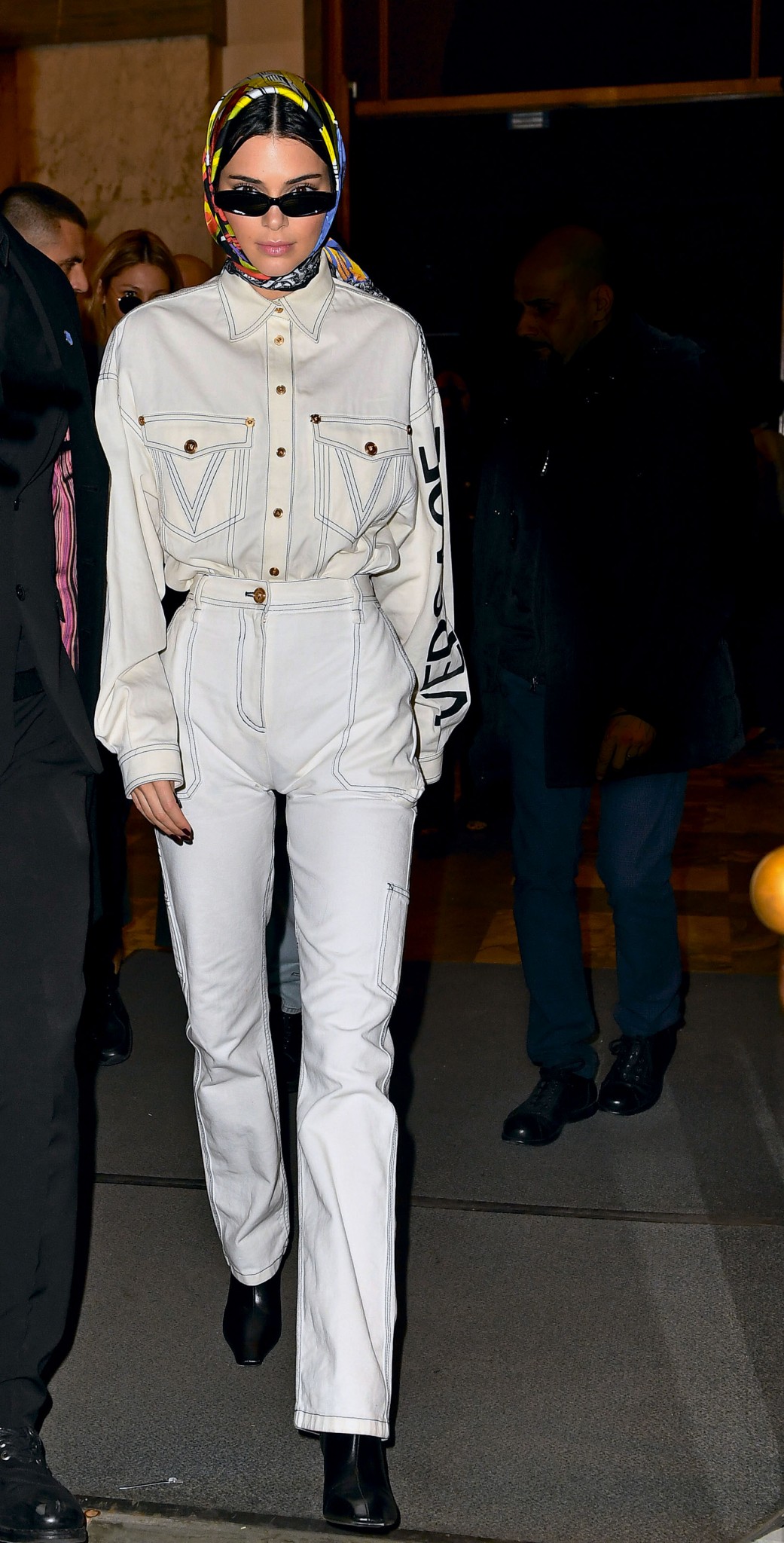Александра: «Пример того, как надо носить светлые джинсы и с чем их сочетать. У Кендалл, на мой взгляд, все отлично: длинные ноги, тонкая талия, брендинг, цветовой акцент на платке. А главное – эту девушку белый не полнит».