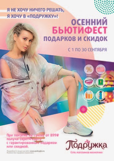 До 30 сентября в сети магазинов «Подружка» проходит осенний фестиваль подарков и скидок за покупку на определенную сумму. Лицом рекламной кампании стала певица Клава Кока.