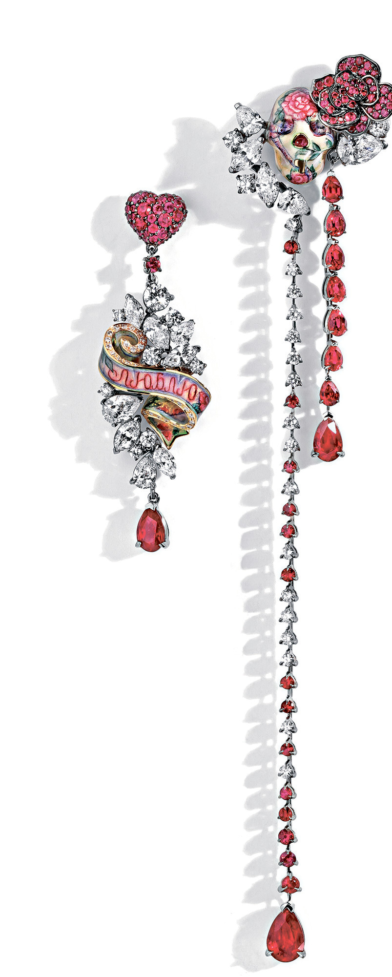 Серьга «Лента»; серьга «Череп с розой» длинная, все – белое и желтое золото, бриллианты, рубины, гильошированная горячая эмаль, «Тату», Liza Borzaya