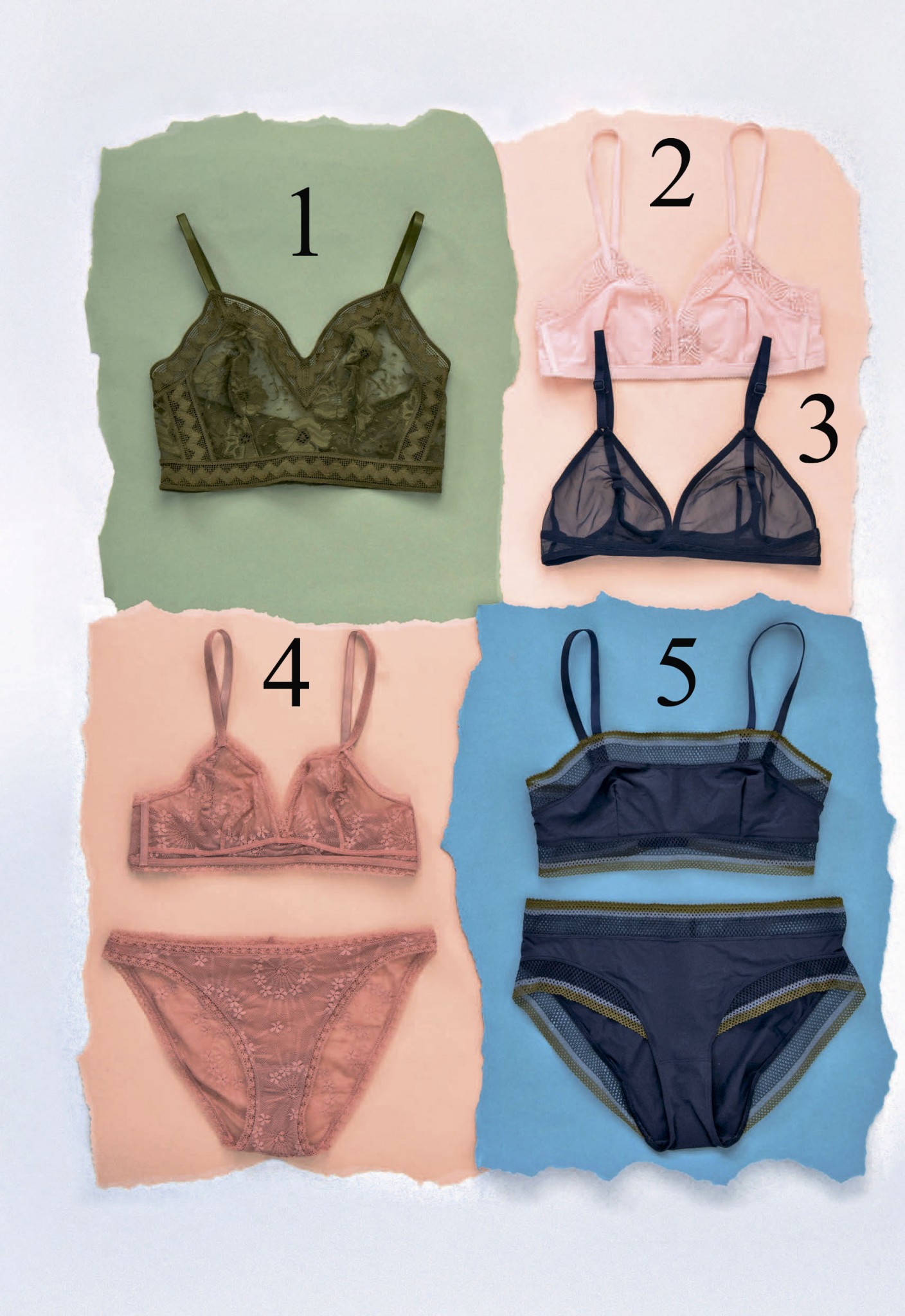 1. Кружевной бюстгальтер-топ, Anemone. 2. Бюстгальтер из стретч-жаккарда и кружева, Merveilles. 3. Бюстгальтер из стретч-тюля, Tulle. 4. Кружевные бюстгальтер и трусы, Artifices. 5. Бюстгальтер и трусы из джерси-стретча, Rainbow. Все – Eres