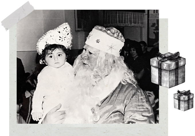 «С детства Новый год был для меня самым волшебным и любимым праздником. Я, как и все дети, всем сердцем верила в чудеса и магию новогодней ночи. Ждала этот день, чтобы загадать самое заветное желание, и была уверена, что оно обязательно сбудется. Квартира наполнялась ароматом апельсинов и мандаринов, а стол – всевозможными сладостями, в том числе обязательными символами – козинаками и чурчхелой. И конечно, были свечи, елка и ожидание чуда. Дед Мороз приходил к нам до наступления полуночи, чтобы лично поздравить, а мы, дети, наряжались в праздничные костюмы и ждали его, чтобы удивить своими песнями, стихами и танцами. Готовились усердно, чтобы получить от него долгожданные подарки. На этой фотографии мне три года, я на утренней елке в Доме офицеров. Из всех детишек мне повезло больше всех: Дед Мороз заметил меня и взял на руки. А я смущенно рассказываю ему стихи. Тот момент остался в памяти как минута полного счастья. Я уже давно не ребенок, но в преддверии Нового года впадаю в детство и, как маленькая девочка, жду чуда. И это необыкновенные ощущения! Праздник я встречаю со своей большой и дружной семьей, с детьми, внуком – и это невероятное счастье!»