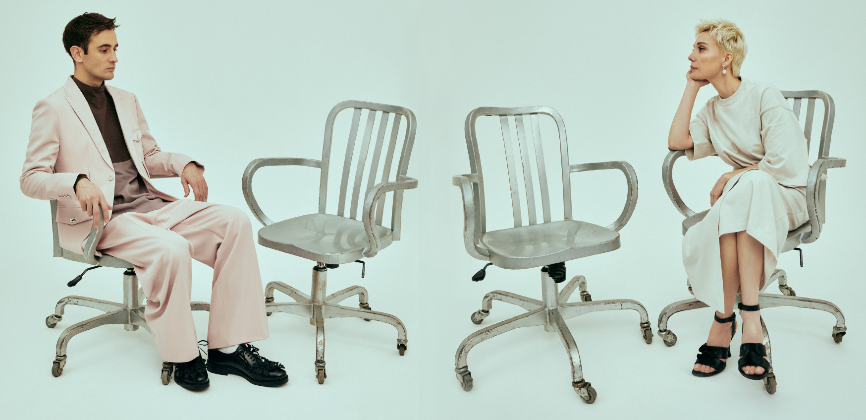 На Ринале: Пиджак, джемпер и брюки, Dior Men; ботинки, Prada; носки, Falke. На Чулпан: платье, Balenciaga; босоножки, Valentino Garavani; серьги Classic, Mercury (белое золото, жемчуг, бриллианты).