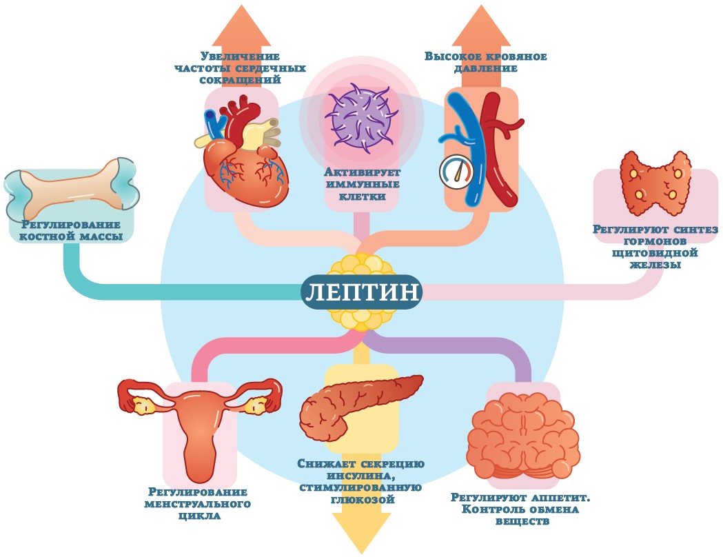 Кроме того, лептин подавляет повышенный синтез инсулина, нормализует работу щитовидной железы, активизирует синтез молекул АТФ – вещества, в котором запасается энергия. Этот гормон отлично справляется с поддержанием веса. Если человек переел, он заставит его больше двигаться и расходовать калории. А если съел меньше, переведёт организм в режим экономии, сжигание жира замедлится и физическая активность снизится.