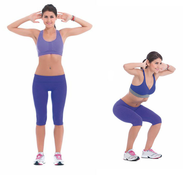Исходное положение: ноги на ширине плеч, руки сложены за головой. Теперь нужно начать медленно приседать до того момента, пока колени не образуют прямой угол. Задержитесь в этом положении 20 секунд. Затем медленно вернитесь в исходное положение. Сделайте 2 подхода по 15 раз.