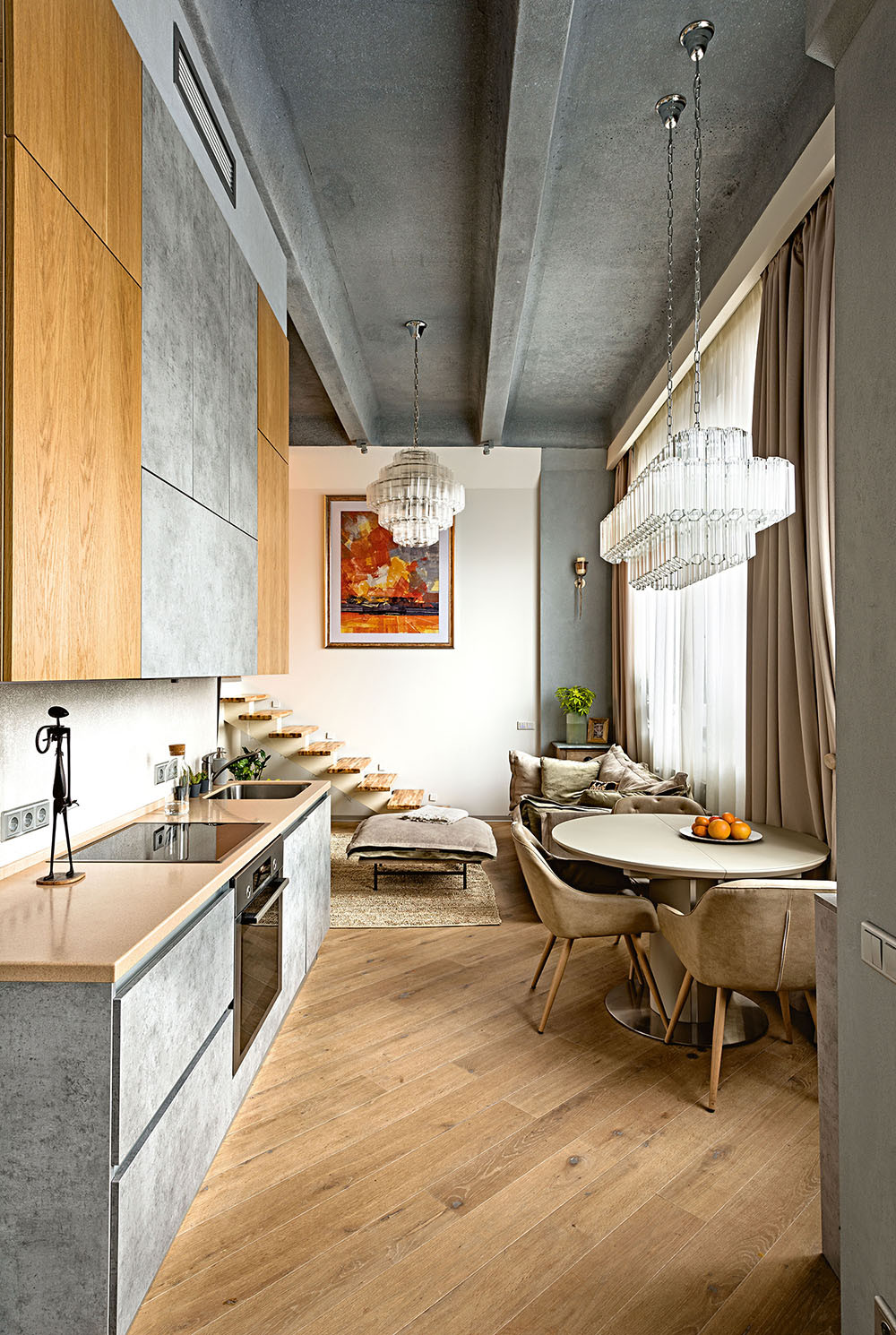 Дизайн. Лофтовая атмосфера создана последовательно и эффектно. Открытые потолочные балки стали одним из основных выразительных акцентов интерьера, а оттенки серого в отделке стен и части мебели подчеркнули этот сдержанный брутальный лейтмотив. Открытая студия с С-образной планировкой, обтекающей «хозяйственное ядро» (санузел и гардеробную), выглядит просторно и в то же время создаёт ощущение частичной автономности каждой зоны. Спальню на антресоли скрывают трёхсекционная полностью остеклённая перегородка и раздвижная портьера. Баланс холодных и тёплых тонов, игра на оттенках и натуральных фактурах в декоре, эмоциональные картины Натальи Авдеевой гармонично обогащают структурнопланировочное решение.