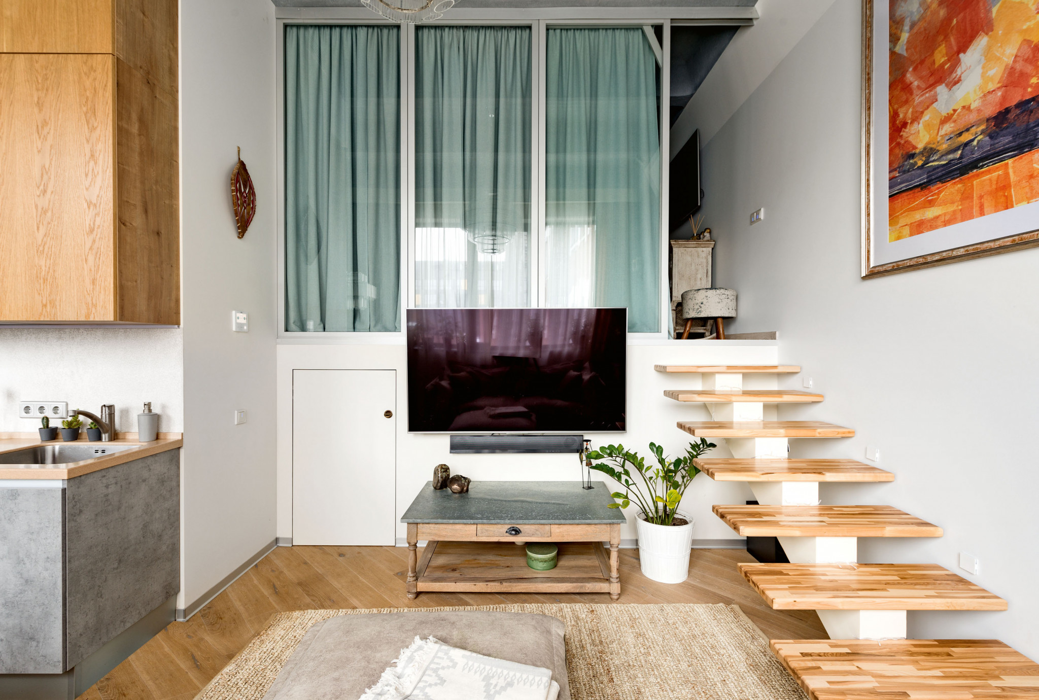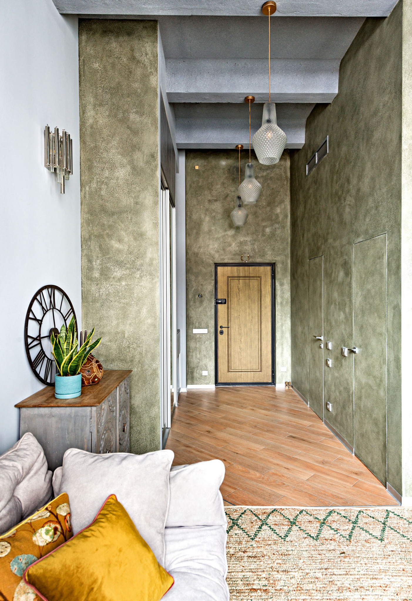 В двух объединённых квартирах, которые расположены в реновированном столичном доме, нашли способ увеличить площадь не только по горизонтали, но и по вертикали. Исторические корни постройки подчеркнули посредством лофтовой эстетики. Также в интерьер привнесли толику индийской этники
