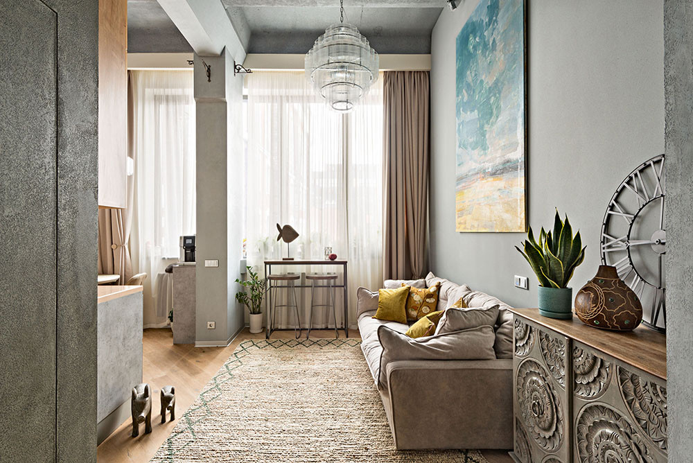 Лофтовую эстетику формируют материалы отделки (штукатурка под бетон, широкие планки ламината), предметы обстановки (диван, похожий на подушки, сшитые на лицевую сторону, массивная тумба под ТВ); нотки этники привнесены в интерьер элементами декора.