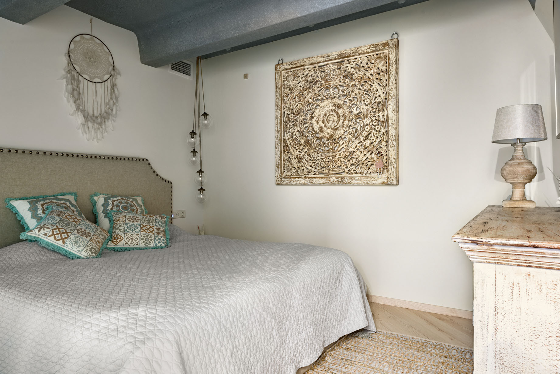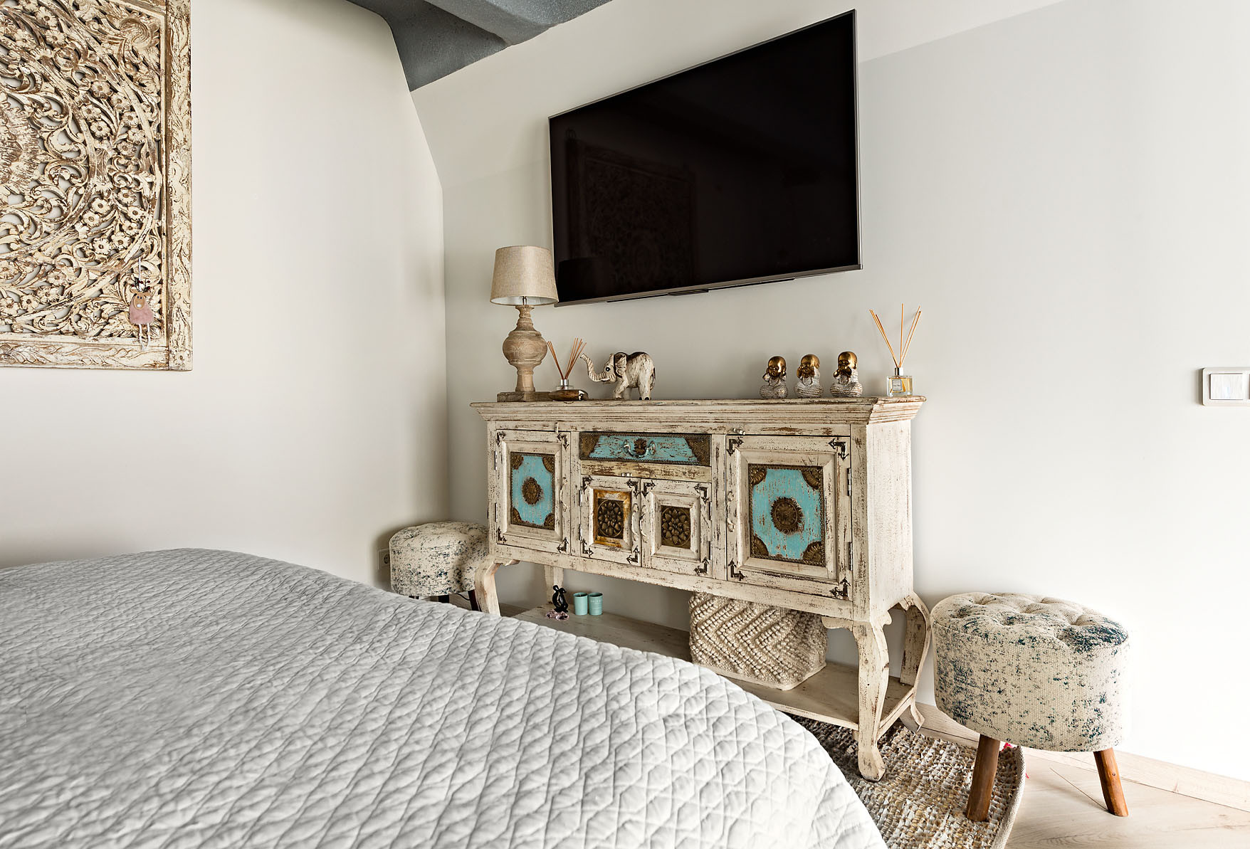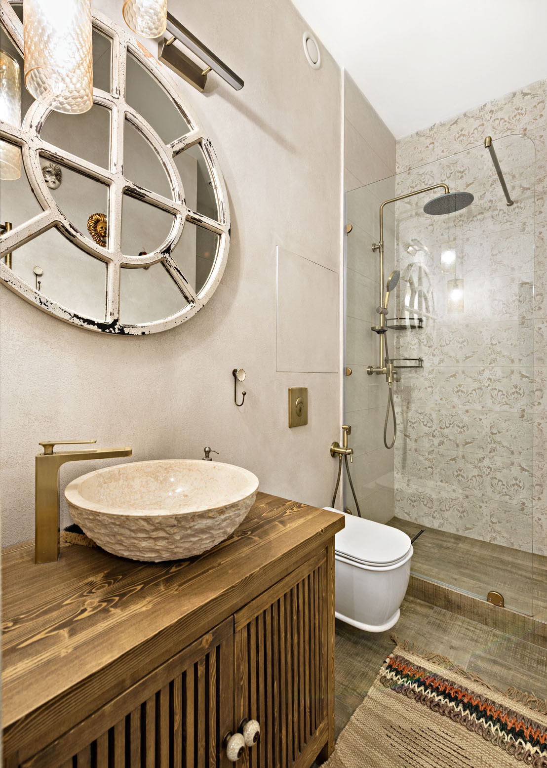 Заказчица много путешествует, поэтому в проекте немало этнических и эклектичных предметов, особенно в спальне и санузле, где собраны интересные контрастные текстуры: отдельно купленная деревянная тумба, на которую установлена каменная раковина-чаша с рельефными внешними стенками, узорчатая плитка в отделке просторного душевого отсека, окрашенные стены, эффектное винтажное зеркало над умывальником в состаренной раме, напольный керамогранит под дерево. Ванная комната служит продолжением этнической темы в спальне, но в менее акцентированном варианте. Стену напротив умывальника украшают декоративные сувениры — в таком оформлении мокрая зона воспринимается скорее как продолжение жилого интерьера, при этом не выбивается из общей колористики.