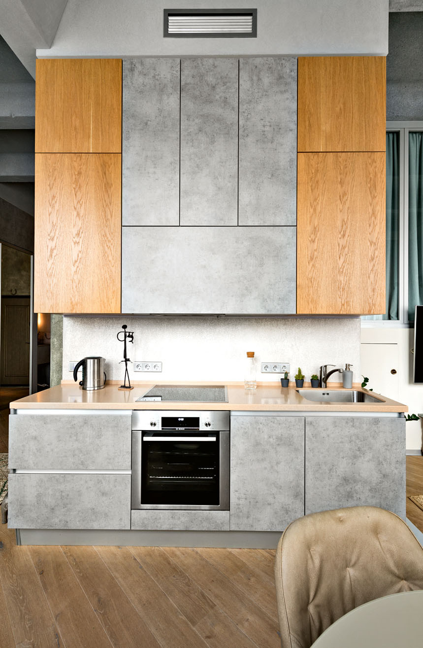 Дом, в котором расположена квартира, — яркий пример, когда на смену «классическому» редевелопменту старых фабрик приходят ультрасовременные архитектурные проекты. Комплекс ЖК «Лофтек» создан в здании бывшего завода счётно-аналитических машин. Заказчице понравилось его удобное расположение в центре Москвы, но подходящую по площади квартиру она подобрать не сумела. Метраж становился подходящим только при объединении двух квартир. При покупке одной квартиры на вторую давалась скидка, что и стало решающим фактором. Идея проекта — в создании классической лофтовой атмосферы. Кухня расположена в открытом пространстве, на виду, выполнена в отделке под бетон и дерево. Верхние шкафы выше стандартных, под потолок (для максимального использования). Вытяжка скрыта так, чтобы кухня смотрелась единым блоком без дробления на элементы. Холодильник встроен в нишу между вентшахтой и перегородкой, отделяющей кухню, при этом находится не на виду
