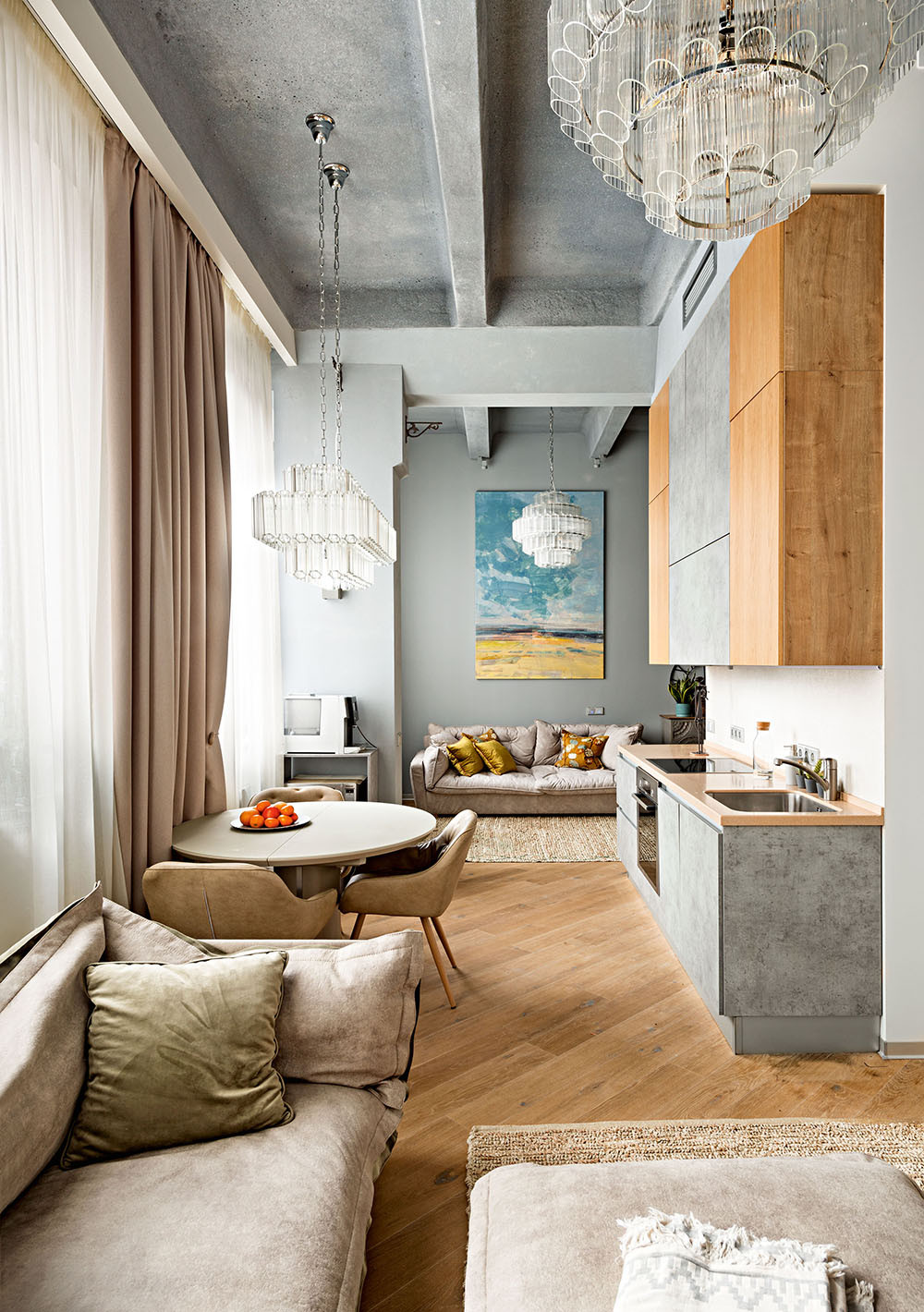 Ремонт. В новой квартире выполнили стяжку, перегородки возвели из пазогребневых блоков. Пол застелили инженерной доской, в мокрых зонах облицевали керамогранитом. Существующие потолочные конструкции с выступающими балками оставили на виду, очистив и нанеся декоративное покрытие. Стены, как и две межкомнатные двери-невидимки, встроенные заподлицо, отделали декоративной штукатуркой, в санузле их частично оформили керамической плиткой.