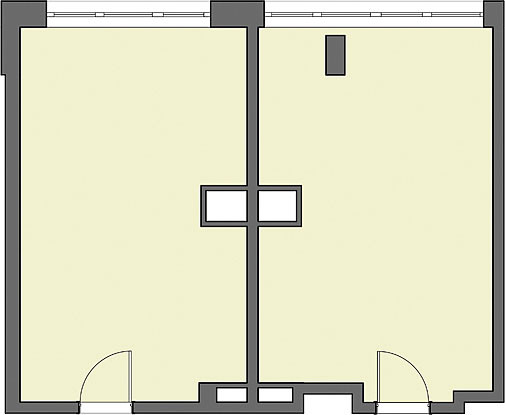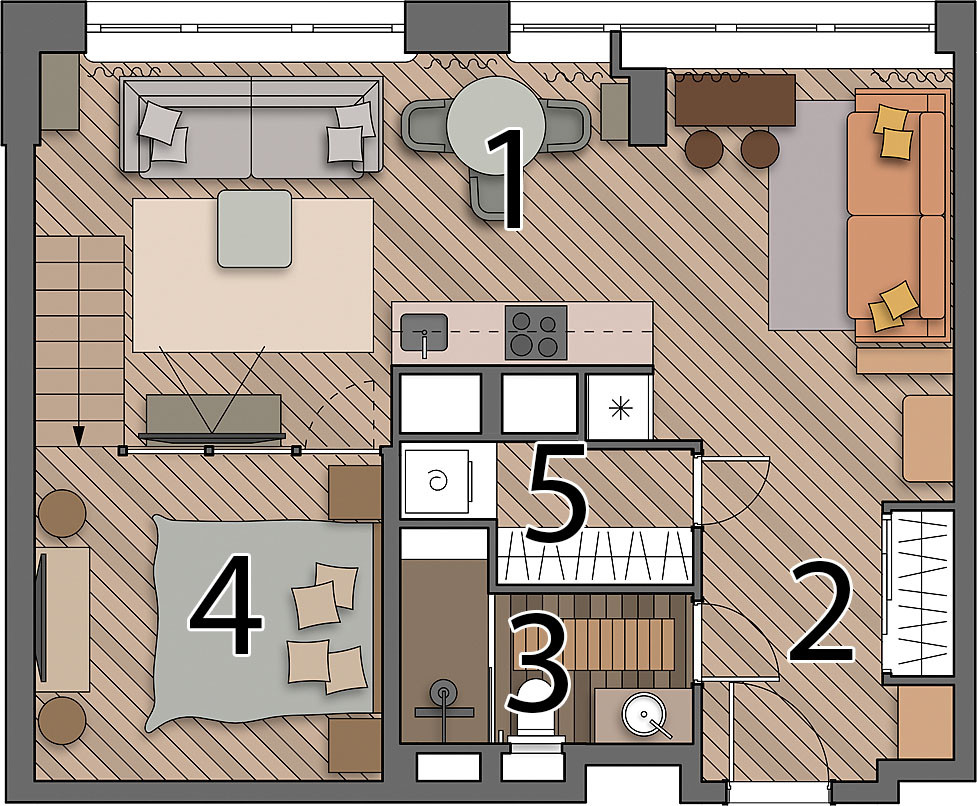 Перепланировка. Основной задачей стало объединение двух идентичных квартир-студий в одну, что оказалось возможным благодаря ненесущей перегородке между ними. На территории одной из прежних квартир расположили входную зону с большим встроенным шкафом, гардеробной комнатой и совмещённым санузлом, а также часть кухни-гостиной; на территории второй — продолжение кухни-гостиной и спальня. Последнюю разместили на антресоли (благо в квартире высокие потолки), под ней обустроили кладовую.