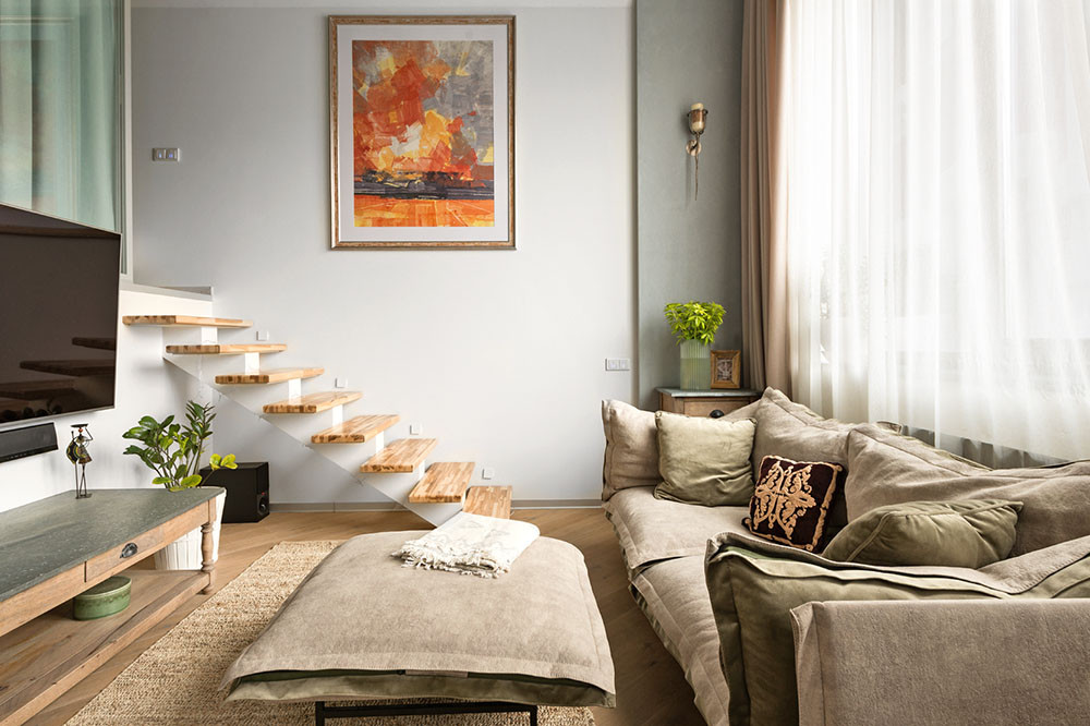 Каждой зоне квартиры удалось придать своё настроение, не допуская резких стилистических контрастов, за счёт выдержанной в едином ключе цветовой палитры и в то же время оригинальных и рукотворных деталей обстановки