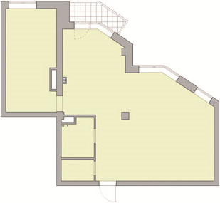 Перепланировка. Изначально планировка была свободная, без перегородок, кроме детской (прямоугольное помещение в левой части плана) и санузлов. Присутствовали также две бетонные колонны: одна у стены, а другая в центре квартиры — и массивные бетонные балки вдоль всех окон. У квартиры сложная форма: фасадная стена скошена под углом 45˚. Пространство ломаной формы надо было сделать более гармоничным, что и удалось за счёт простого и гениального решения: между нынешними спальней и гостиной поставили перегородку под углом 90˚ к фасаду, а другой перегородкой разделили прихожую и гостиную. В результате перепланировки центральная бетонная колонна «ушла» в эту перегородку и стала совершенно незаметной. Также появилась зона гостиной, где разместили диван и журнальный столик. Перепады фасада оказались таким образом обыграны как дополнительные возможности разделения гостиной и столовой.