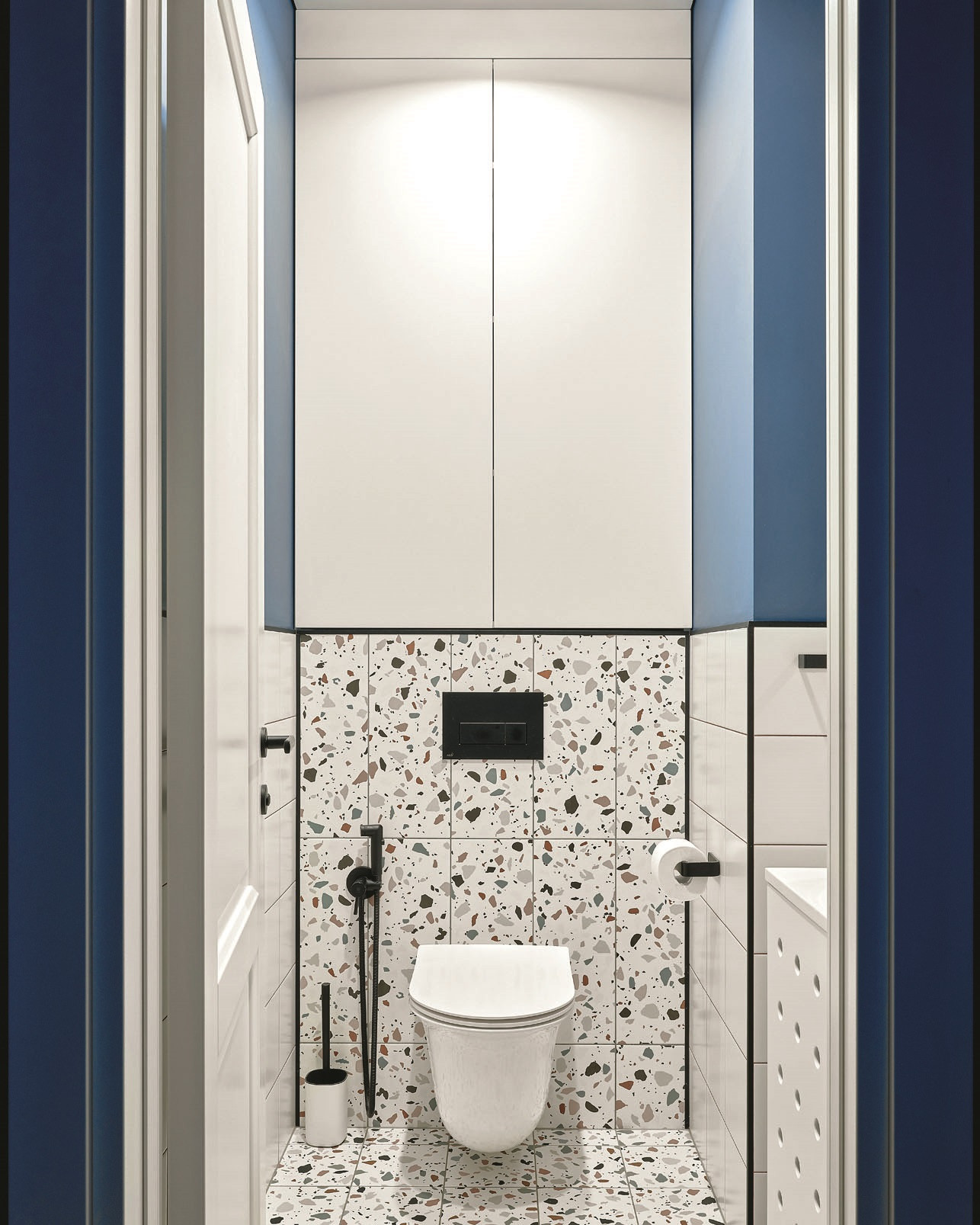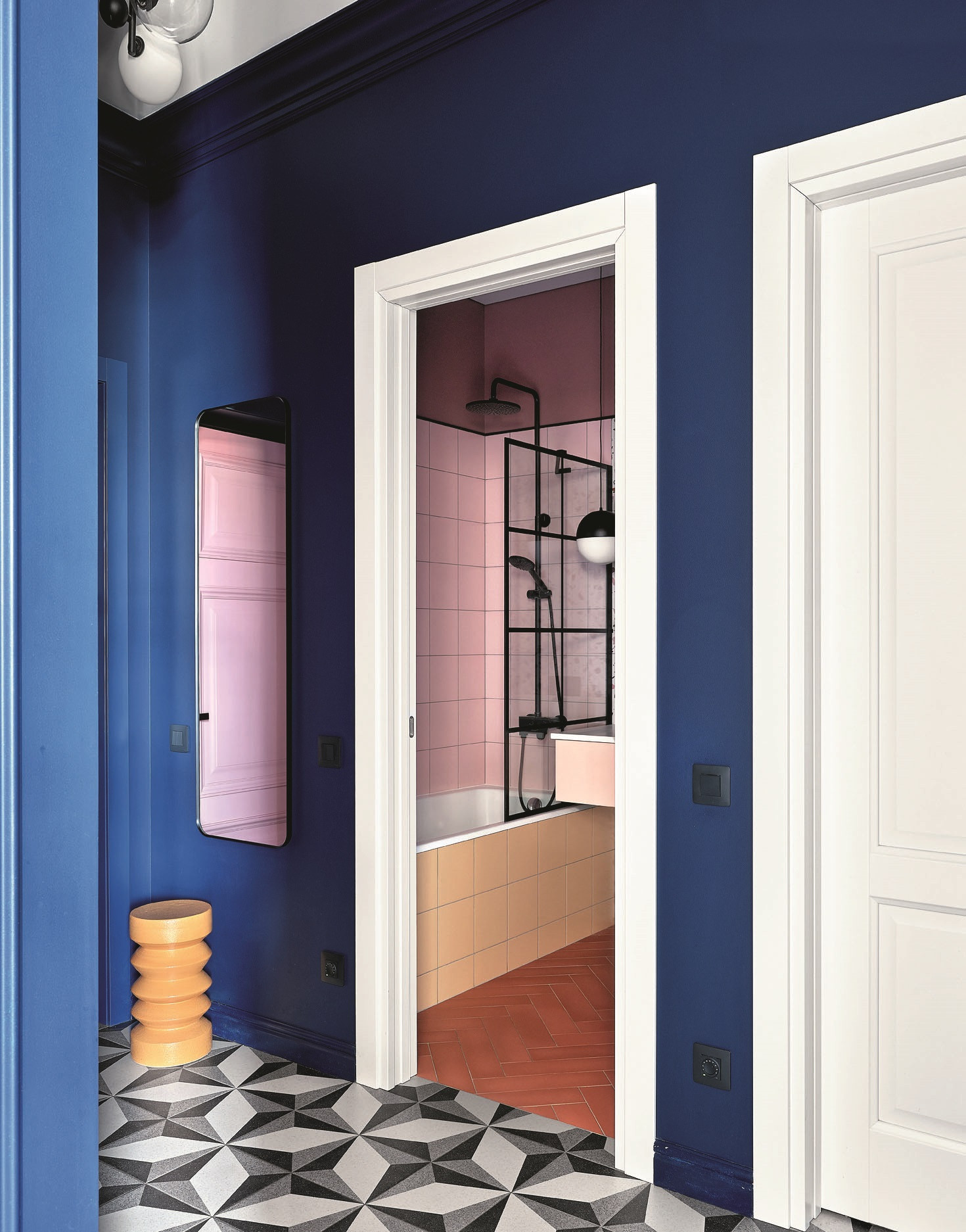 «Запрос от клиентов был — сделать два санузла, — рассказывает дизайнер. — Они располагаются рядом и оформлены в похожем стиле с заметным влиянием mid-century. Оттенки словно припылённые, приглушённые: мягкий жёлтый, серо-голубой, неяркий розовый. В качестве акцентных цветов использованы чёрный и белый. Овальное зеркало и круглые светильники в главном санузле — тоже элементы стиля. И конечно, керамогранит под терраццо. Изначально терраццо — это цемент с кусочками мрамора, но сейчас делают керамогранит, идеально имитирующий этот материал. А с точки зрения удобства он даже лучше». Автор проекта любит использовать плитку с орнаментами, особенно геометрическими, и всегда в курсе новых коллекций. Разрабатывая дизайн санузлов, она выбрала подвесные тумбы под раковину и подвесной унитаз — с ними пространство выглядит легче (плюс такие конструкции облегчают уборку). Модная тенденция — плиткой выложены не все стены целиком, в верхней части они окрашены, и яркая краска на контрасте с плиткой выглядит как нарядный фриз.