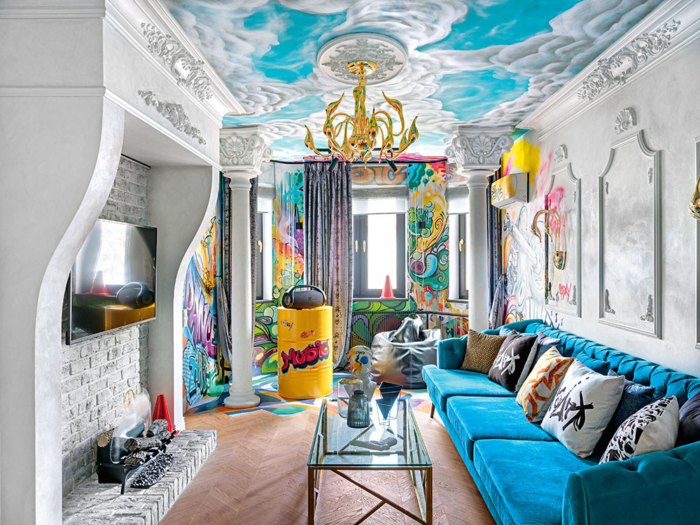 За возвышенное настроение отвечает эстетика барокко, а в уникальное пространство для жизни и общения помещение превращает дерзкий street art. Необычный симбиоз стилей получился из-за разных предпочтений владельцев, их огромного желания кардинально изменить среду обитания, и фантазии дизайнера