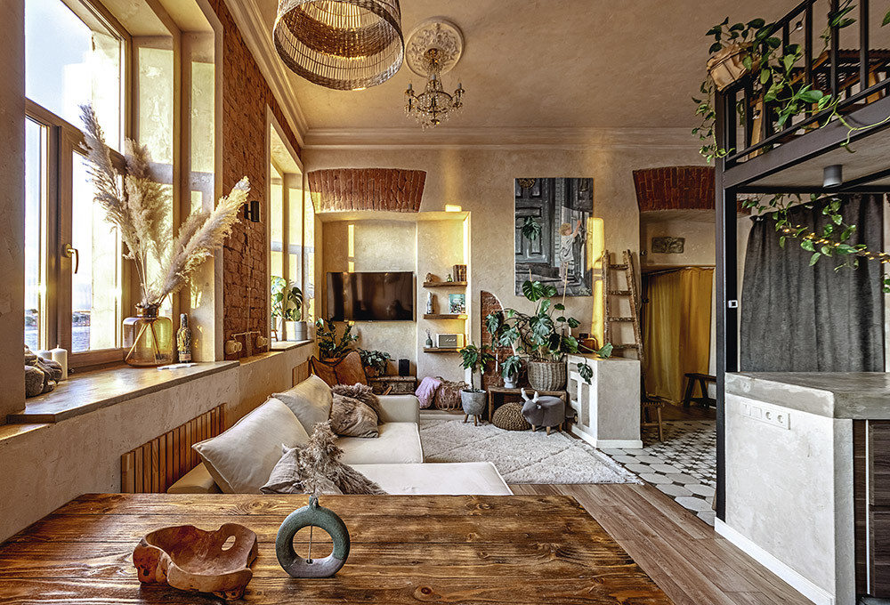 Старая кирпичная кладка, и особенно арочные своды, несущие нагрузку только за счёт боковых распоров, демонстрируют уникальность квартиры. Дизайнер дополнила аутентичность материалов самодельной штукатуркой, внесла в интерьер элементы родственных стилей, а всю современную начинку спрятала среди декоративных деталей
