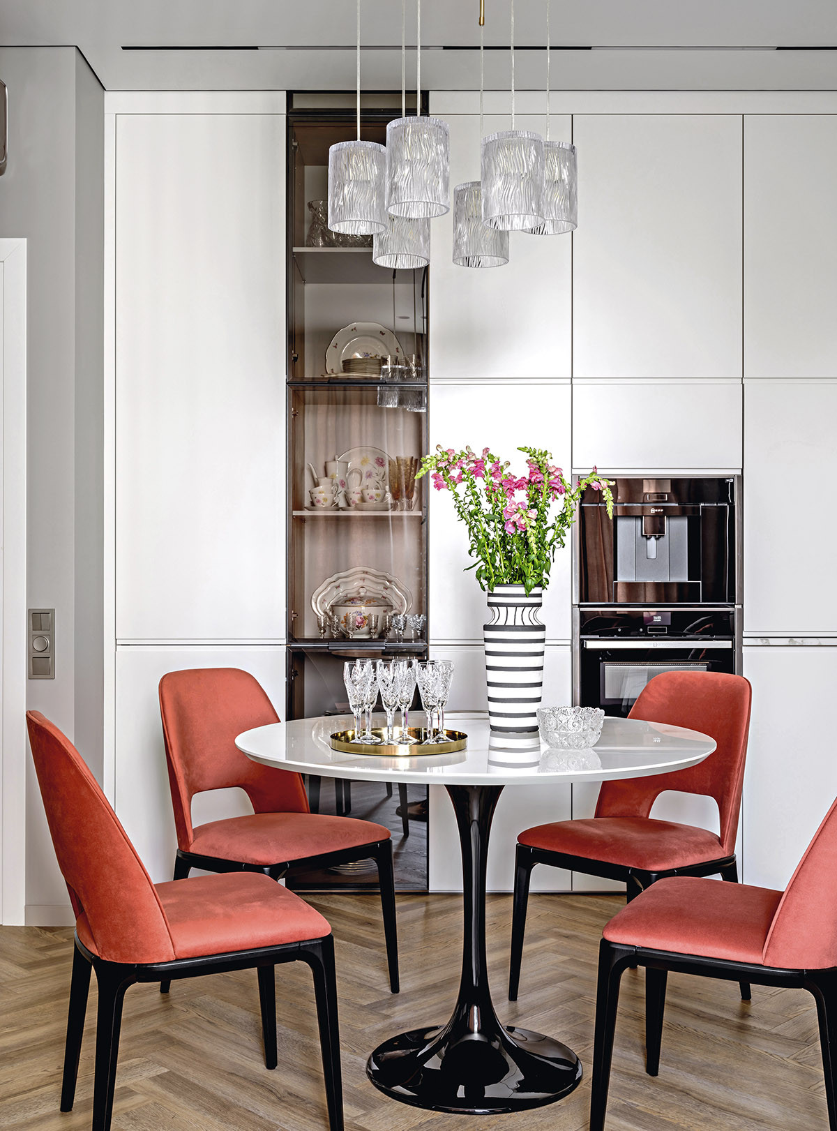 Дизайн. Роль доминанты интерьера отведена кухне-гостиной. Чтобы минимизировать визуальный шум на кухонной столешнице, дополнительную рабочую поверхность с чайником, тостером и прочей мелочью скрыли за легко открывающимися мебельными дверцами. Функции навесных шкафов переданы вместительным пеналам. Их светлые фасады и интегрированные ручки добавляют конструкции лёгкости. Канальную вытяжку и места хранения скрыли декоративным коробом. Вместе с фартуком и столешницей его облицевали тонким керамогранитом под мрамор. Интерьер получился спокойным, элегантным и удобным для жизни. Его особенностью стали сбалансированная палитра и разновременные детали, оригинально вплетённые в современную канву.