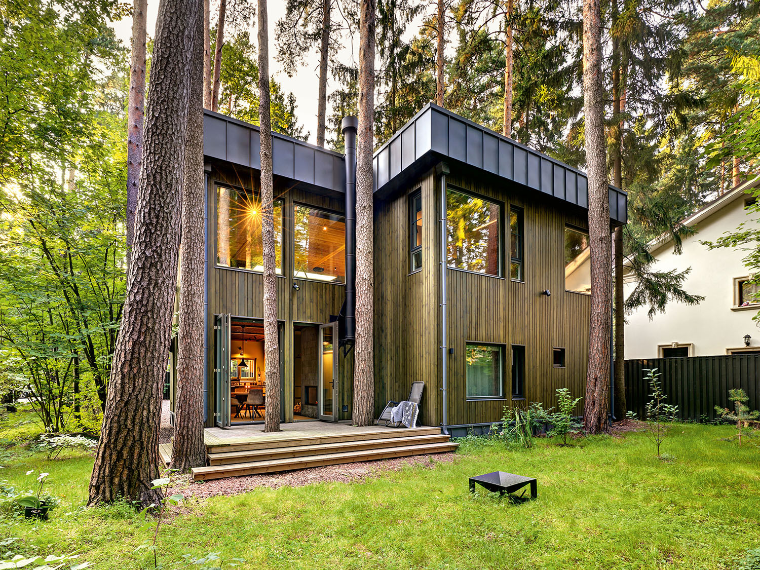 Для возведения современного дома с панорамными окнами была выбрана каркасно-панельная конструкция на основе клеёного бруса. Клеёный брус из плотно-волокнистой сосны подвергается сушке в специализированных тепловых камерах до остаточной влажности 12–15 %, после чего не подвержен усадке и растрескиванию. Из него производят скелет панелей — каркас с выемками и шипами для соединения в паз и гребень. Внутри панелей находятся утеплитель, изолированный от воздействий гидро- и ветрозащитой, пароизоляцией, встроенные элементы внутренних коммуникаций. Сборка дома из готовых панелей, по сути модулей, заняла несколько дней. Благодаря европейской системе решений по герметизации соединений, в том числе оконных и дверных блоков, их герметичность в совокупности с энергосберегающими окнами и утеплёнными стенами предполагает существенную экономию на отоплении. Дом по энергоэффективности соответствует высокому классу «А». И дело не только в счетах на оплату газа и электричества. Экономия энергоресурсов положительно сказывается на экологии — уменьшении выбросов в атмосферу углекислого газа, внося свой посильный вклад в предотвращение глобального потепления.