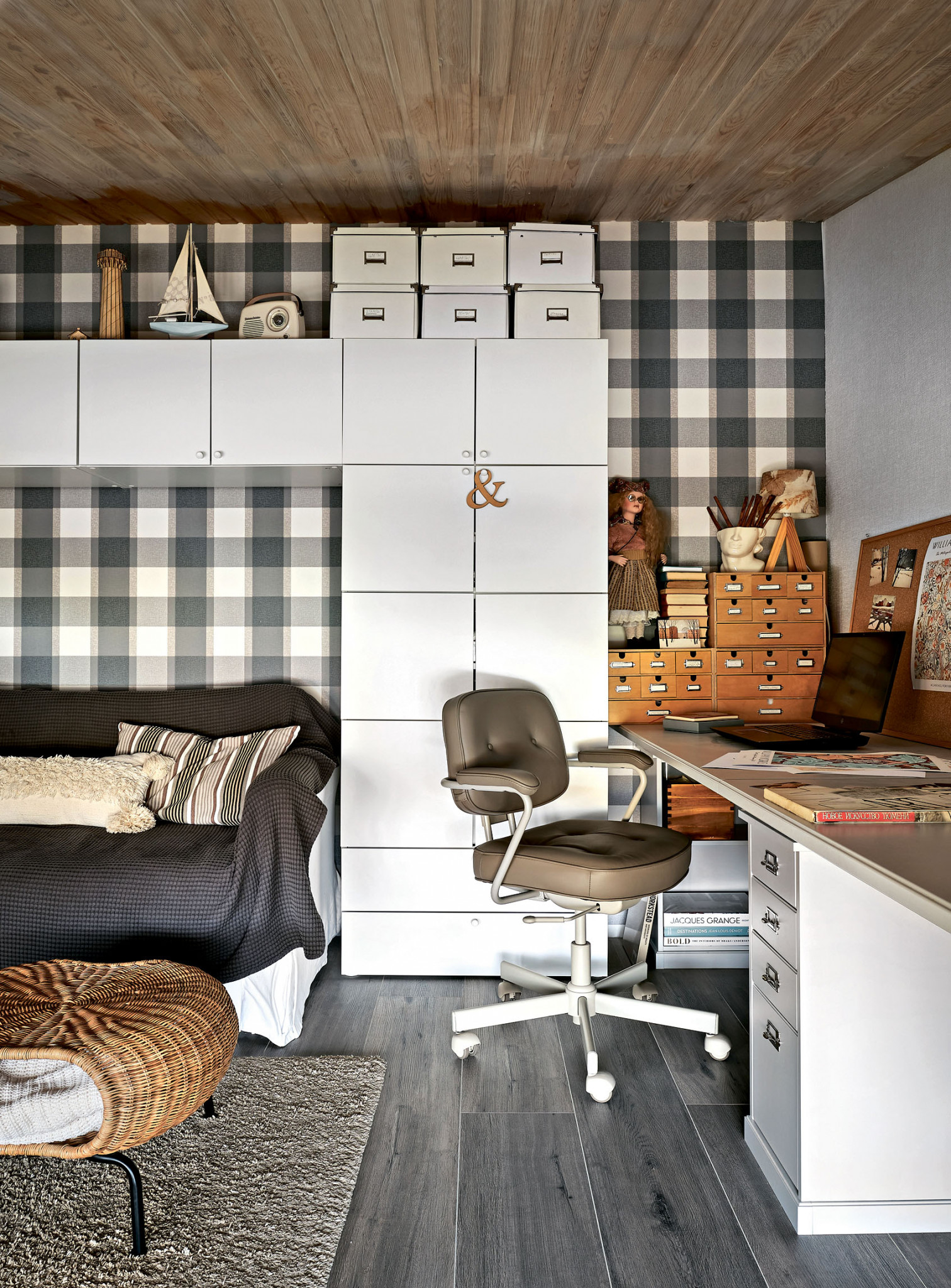 Третий этаж — территория взрослых. Родители часто работают дома, поэтому, помимо спальни, санузла, гардеробной, в самой низкой части этажа под скатной крышей разместился небольшой камерный кабинет.