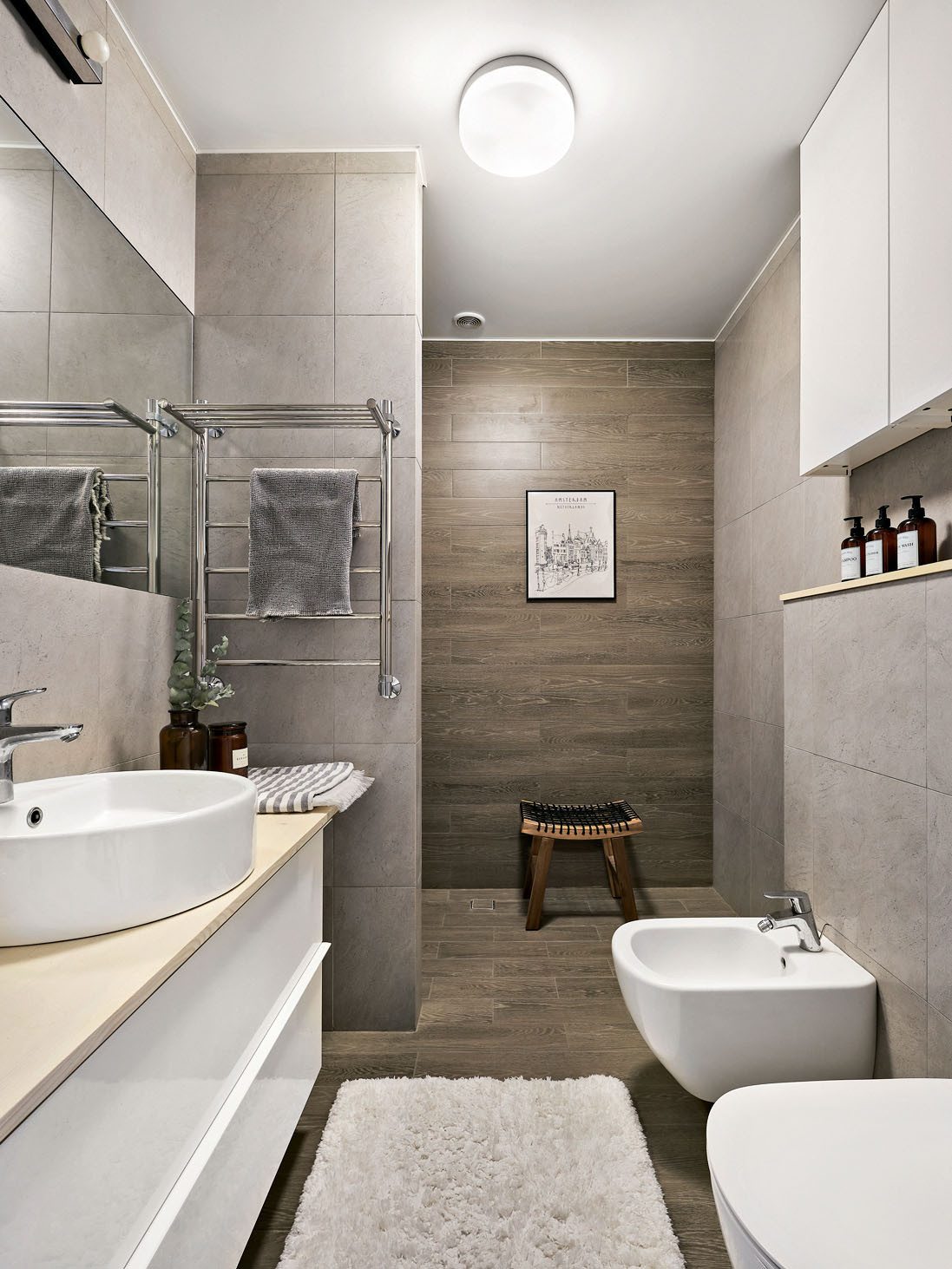 Стены: интерьерная краска, обои, керамический гранит и керамическая плитка (санузлы)