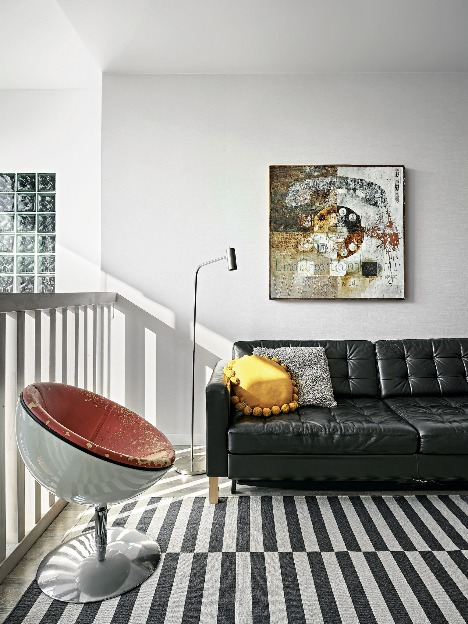 Гармонию в декоре обеспечили натуральные текстуры и нейтральные природные цвета. В качестве акцентов в интерьере использованы светильники из цветного стекла, чёрный металл. Стены украшает живопись, написанная хозяйкой-дизайнером