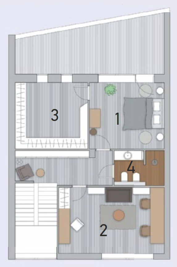 На втором этаже за надёжным ограждением к этому общему объёму примыкает игровая комната детей. У необычного решения имеется очень важное преимущество — родители, находясь в гостиной или в кухне, прекрасно слышат, что происходит наверху. Детям же (дочь-школьница и двое сыновей-дошкольников с небольшой разницей в возрасте) нестандартное пространство, наполненное воздухом и светом, даёт импульс для творчества. Путешественники, пираты, лётчики — в кого только они ни перевоплощаются, глядя с галереи в дали за окнами. На втором этаже также располагаются две отдельные детские комнаты (для девочки и для мальчиков) и санузел.