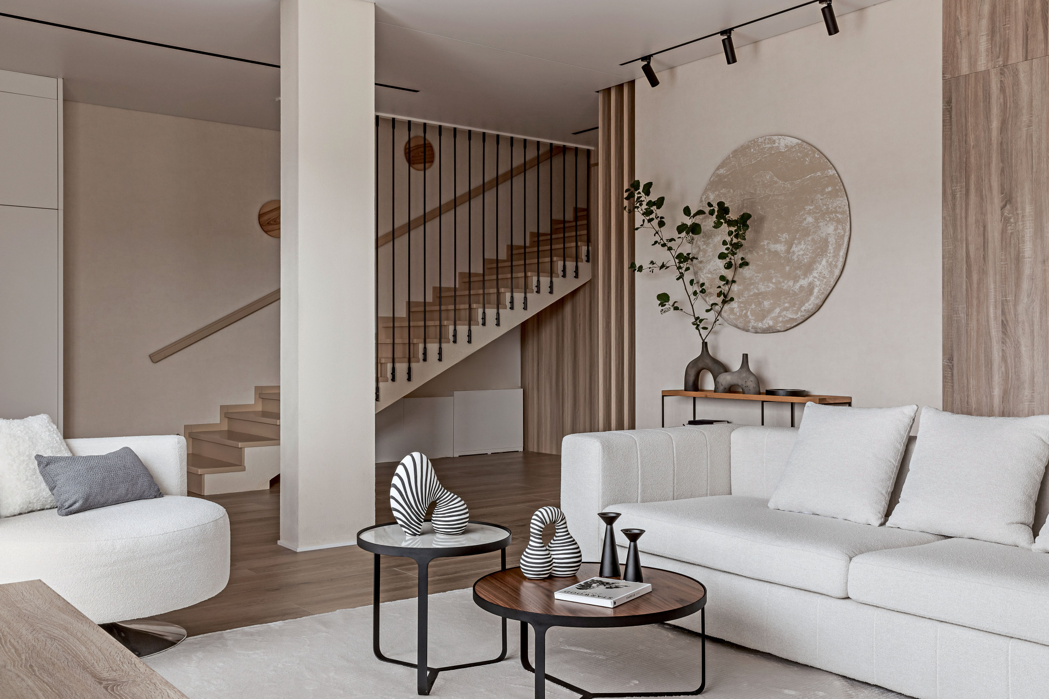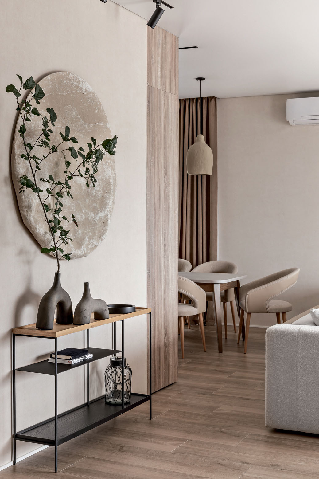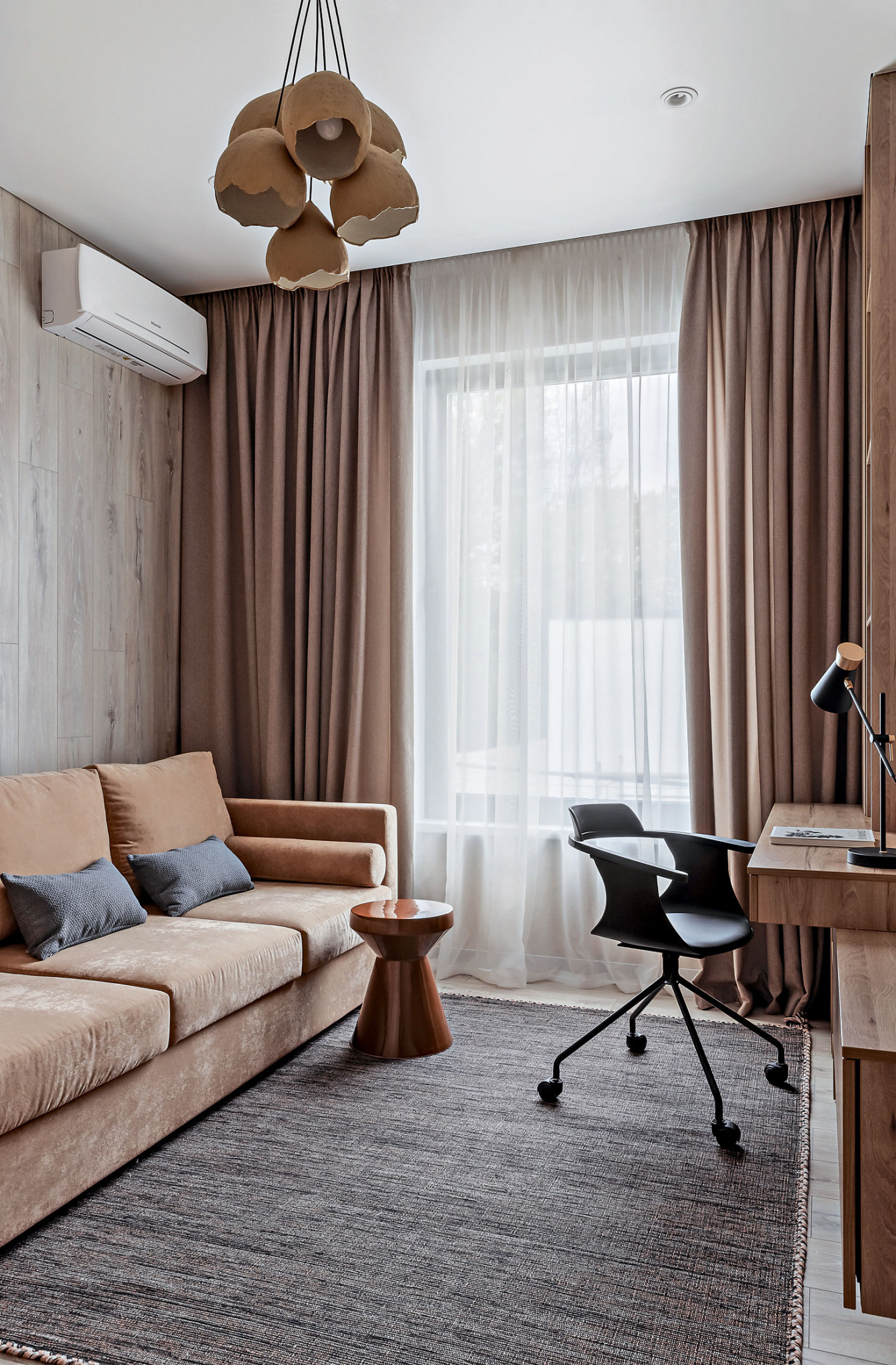 Автор проекта создала уютный, современный интерьер, с красивыми деталями, множеством разнообразных фактур. Достичь цели помогла организация внутреннего пространства и декоративные решения в стиле джапанди. Прежде всего это естественность среды с обилием воздуха и света, лаконичные геометрические формы предметов обстановки. Спокойную, расслабляющую атмосферу создаёт также серо-бежевая гамма, выбранная в качестве основного фона.