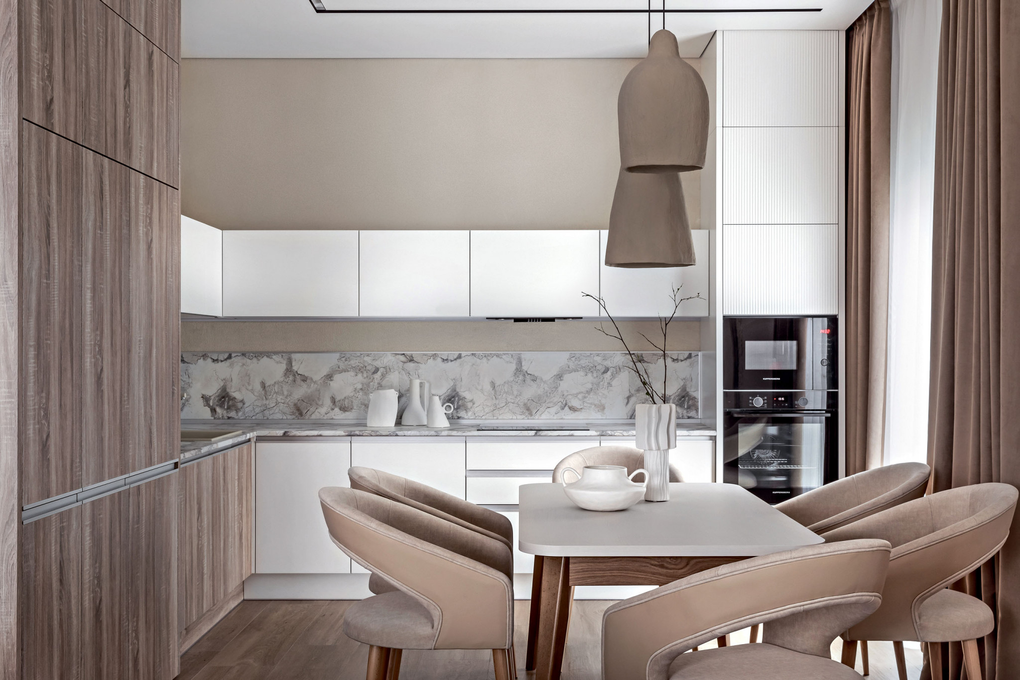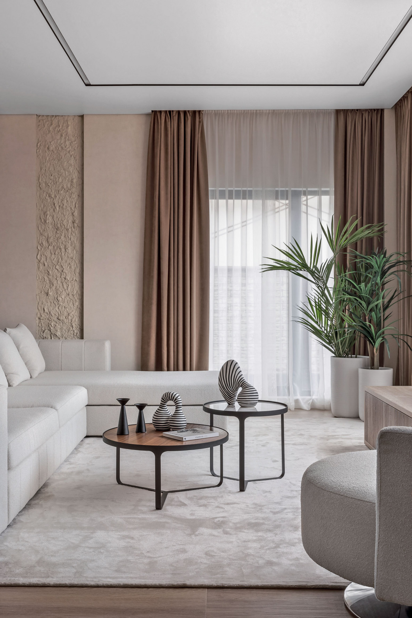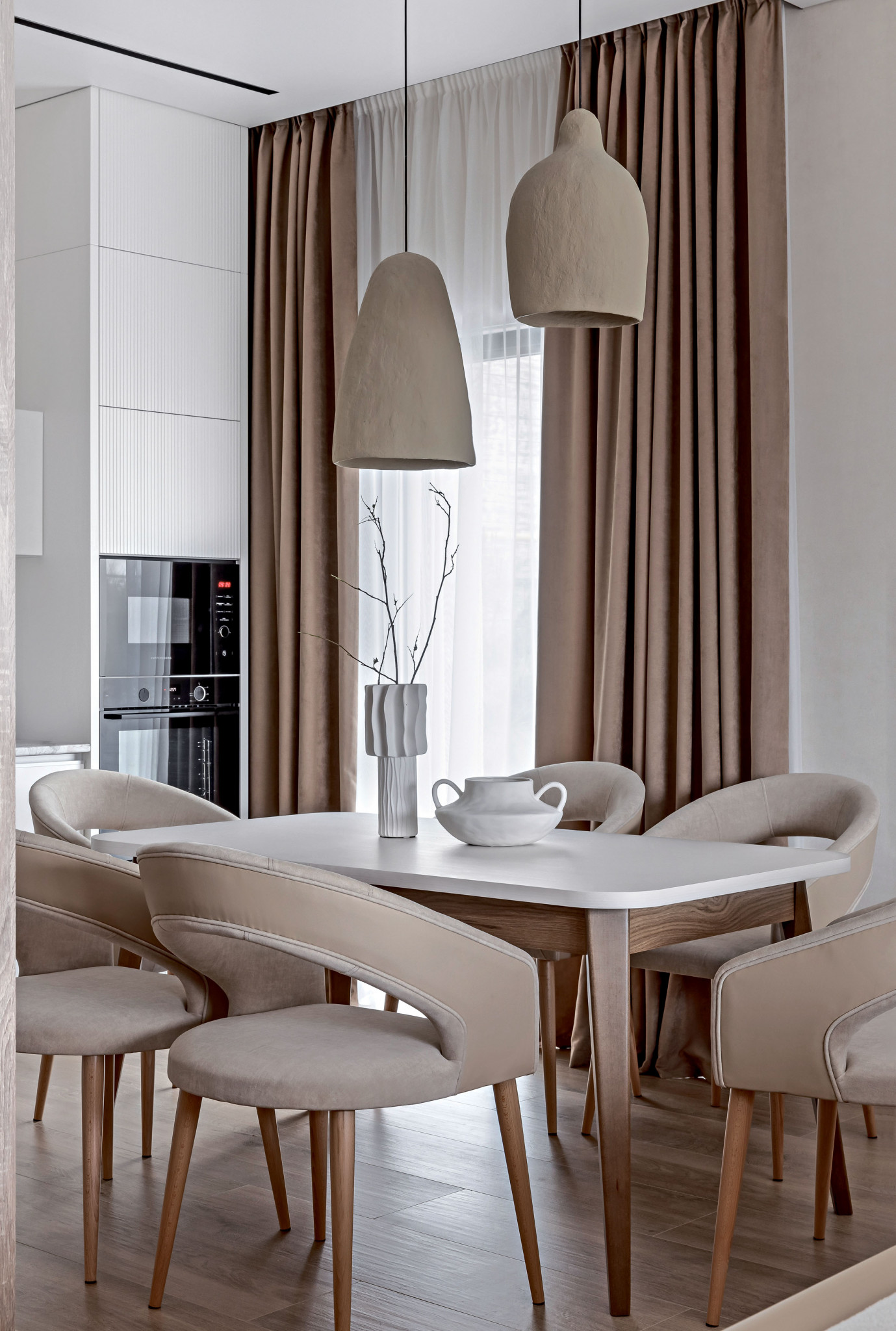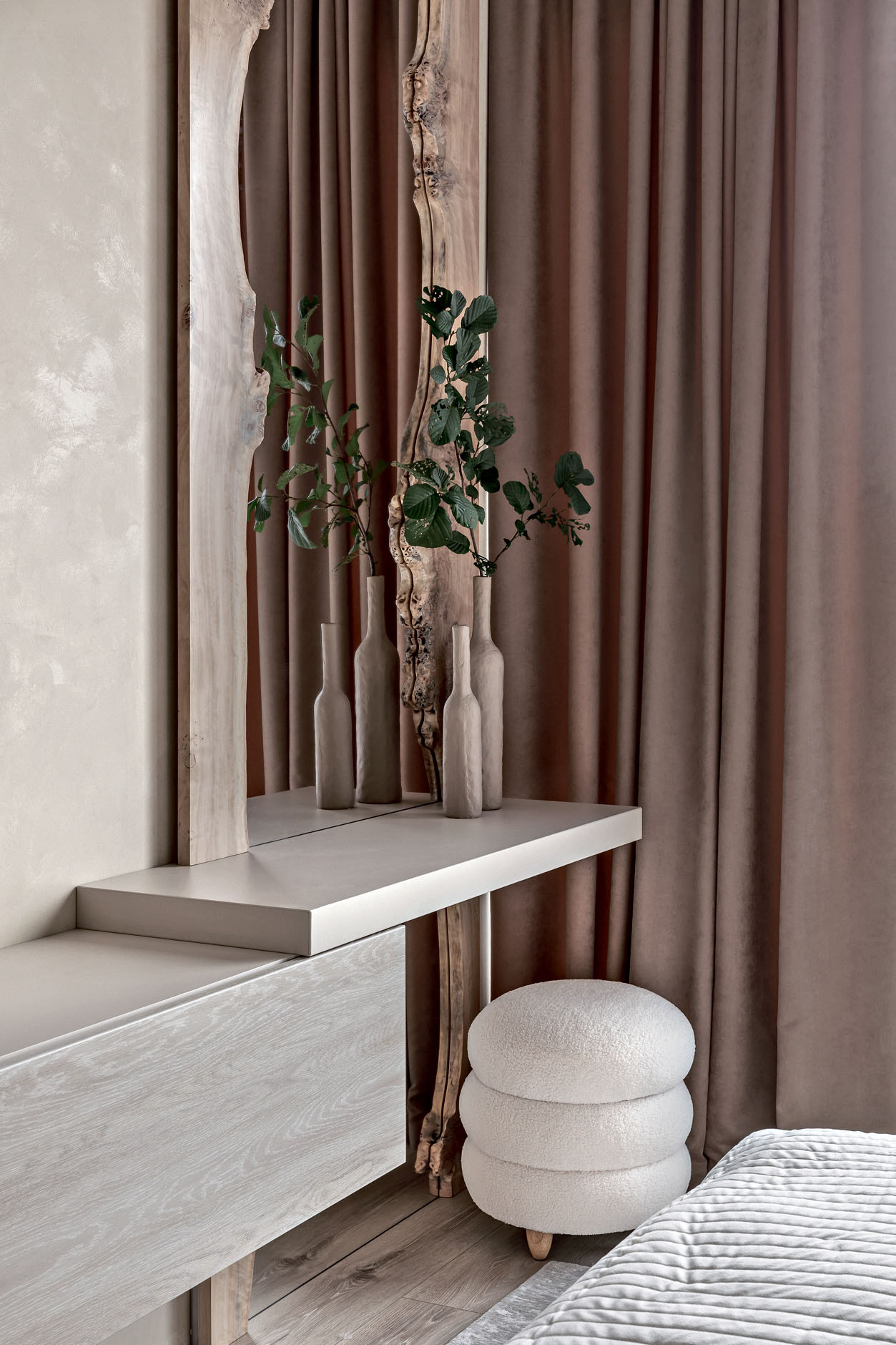 Автор проекта создала уютный, современный интерьер, с красивыми деталями, множеством разнообразных фактур. Достичь цели помогла организация внутреннего пространства и декоративные решения в стиле джапанди. Прежде всего это естественность среды с обилием воздуха и света, лаконичные геометрические формы предметов обстановки. Спокойную, расслабляющую атмосферу создаёт также серо-бежевая гамма, выбранная в качестве основного фона.