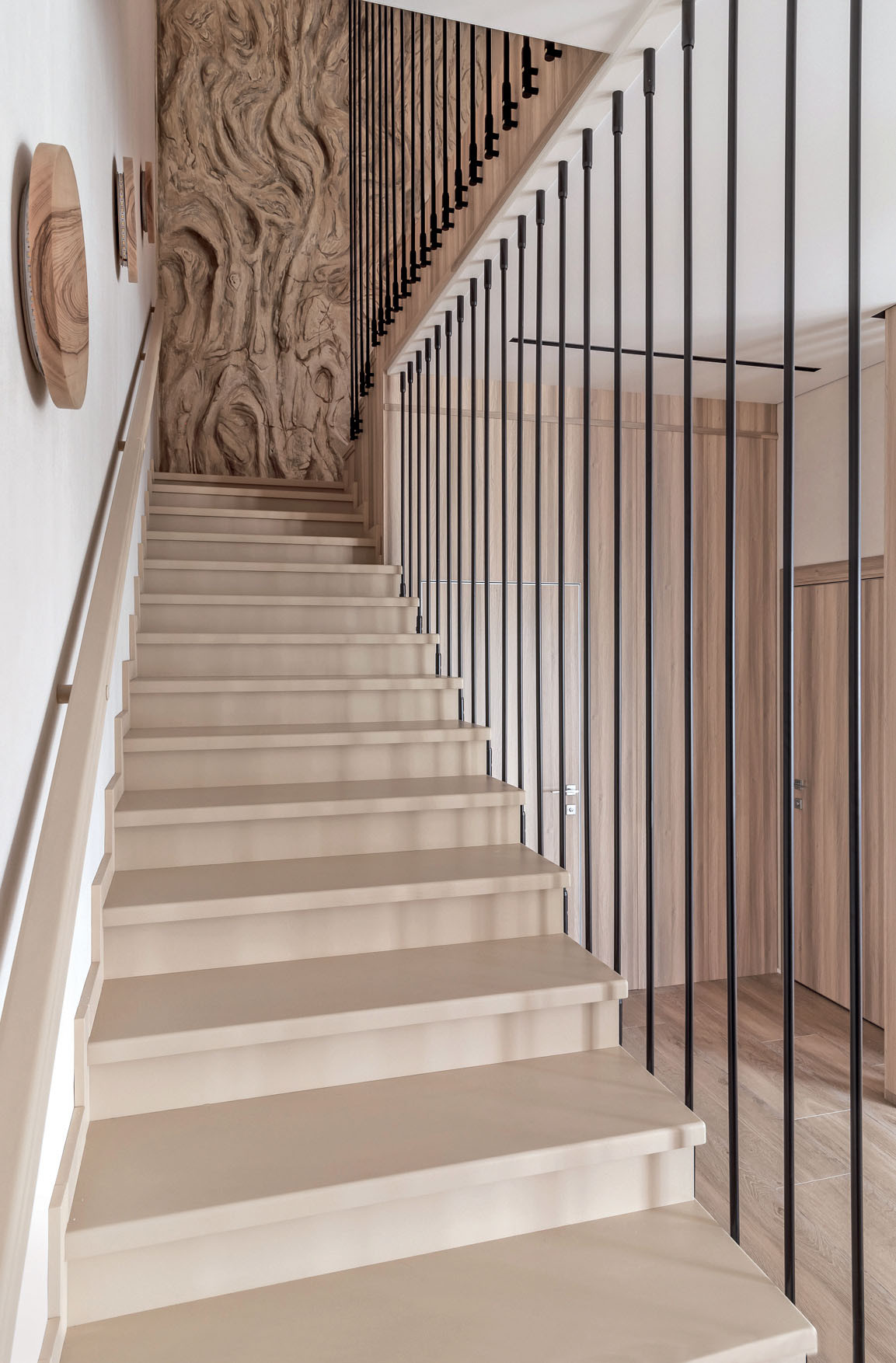 Стены: стеновые панели и рейки Estet, декоративная штукатурка Flugger, фреска бесшовная Wall Street, 3D-панели дизайн-студии ARTEFACT, обои виниловые на флизелиновой основе Erismann, в сауне — деревянная вагонка из липы, в санузле первого этажа — L'Antick