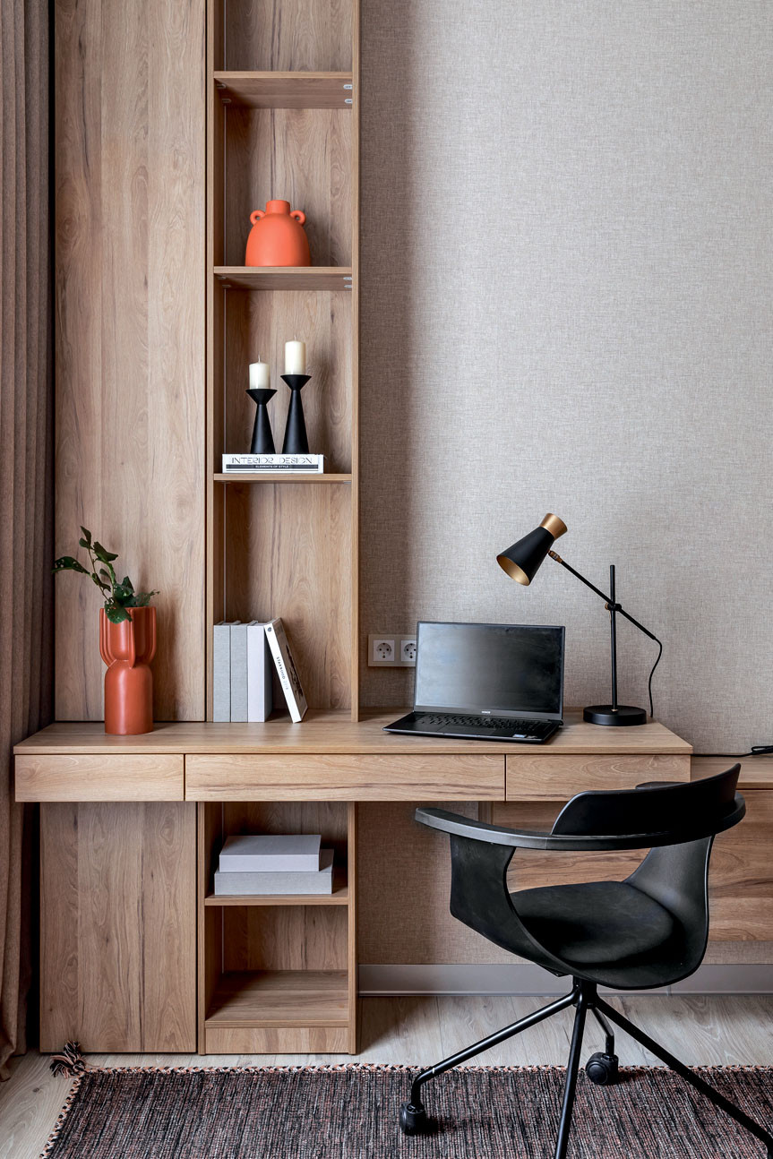 Наследием пандемии COVID-19 стала работа в удалённом формате. Поэтому в доме организован кабинет, который при необходимости превращается в гостевую комнату
