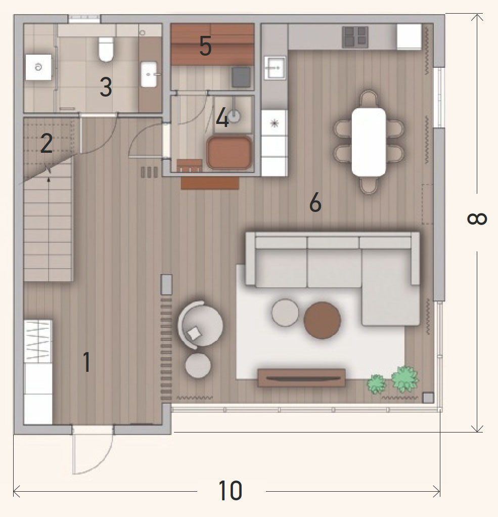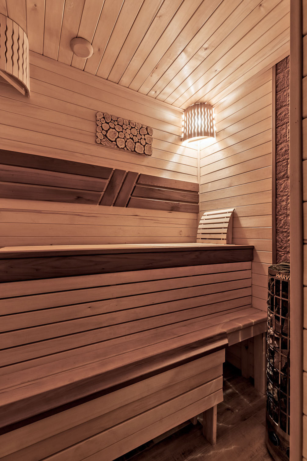 Проект планировочного решения и обстановки хозяйка доверила своей знакомой, руководителю местной дизайн-студии Елизавете Ткачёвой. Предполагалось, что это будет дом для постоянного проживания семьи с дочкой-подростком. Два уровня здания несут разную функциональную нагрузку. Отправной точкой для разработки планировочного решения первого этажа стала сауна. Именно её расположение продиктовало остальную композицию. Площадь дома позволила использовать классический вариант организации пространства, когда парная и моечное отделение находятся рядом, но в разных помещениях. Рядом с душевой кабиной разместили даже деревянную купель. В непосредственной близости от сауны и душевой обустроен санузел. Принудительная вытяжка отводит горячий и влажный воздух, который с избытком образуется во время водных процедур.