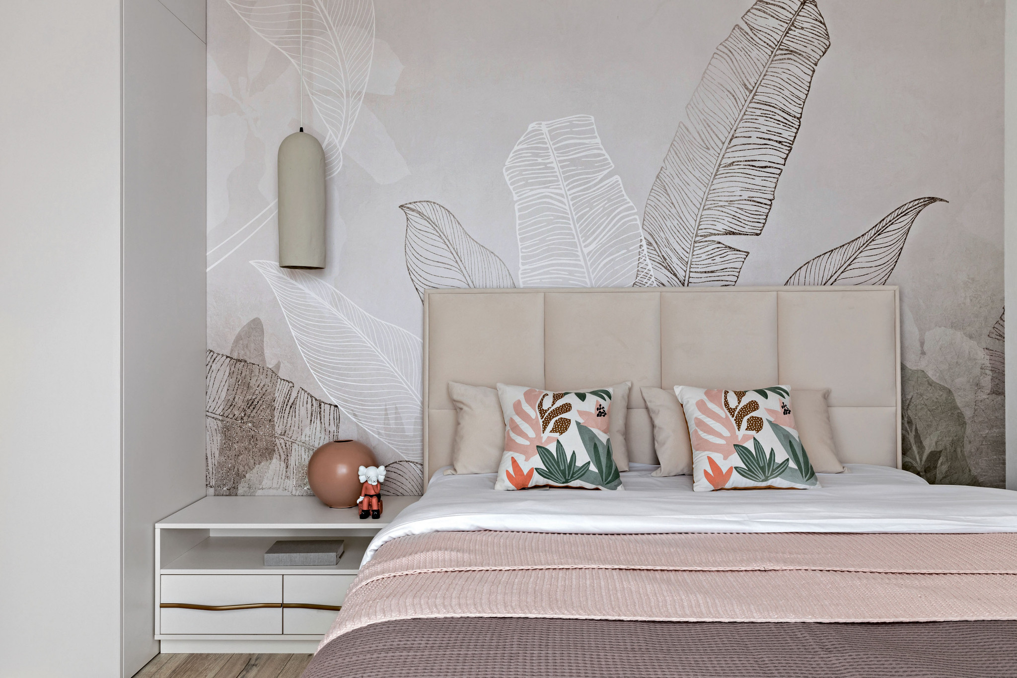 При выборе фрески в детскую комнату дизайнер сделала ставку на полотно с нейтрально-фоновым принтом, который будет актуален долгое время. Кроме того, для ребёнка его комната — это место учёбы, игровая и спальня одновременно. Фреска неярких цветов смотрится здесь органично. Она не мешает уснуть или сосредоточиться на учёбе. Конечно, стена, ставшая акцентной, привлекает внимание, но не перегружает интерьер. А её расположение за изголовьем кровати обозначает функциональную зону. При этом декор не виден во время отдыха и вряд ли надоест.